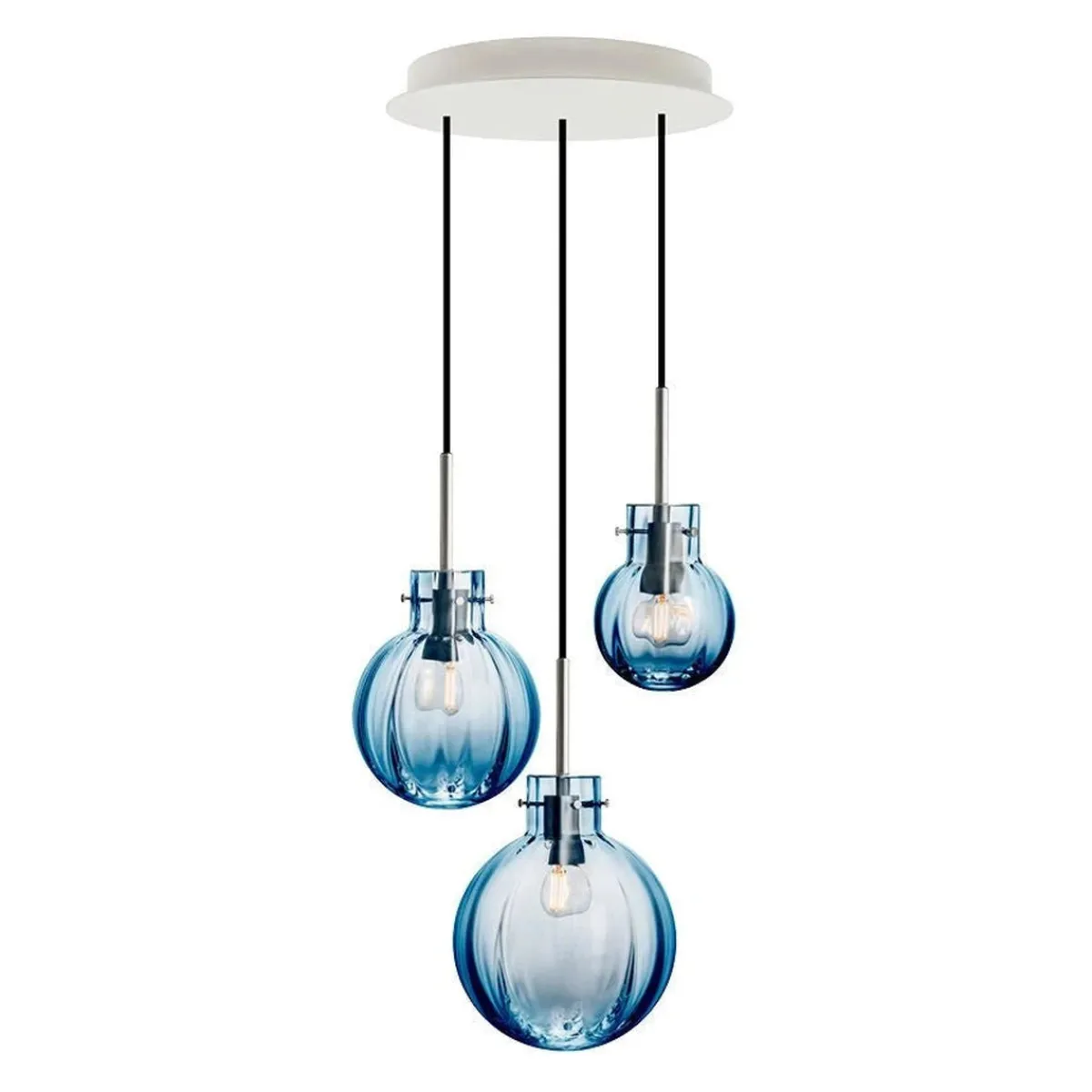 I denne kombinasjonen er det brukt følgende krystallkuler: Optikk stålblå 200 mm, optikk stålblå 160 mm og optikk stålblå 120 mm. Messingoppheng til 3 krystallkuler med sort tekstiltrukket kabel på 3 meter. Rund takbaldakin 34cm.