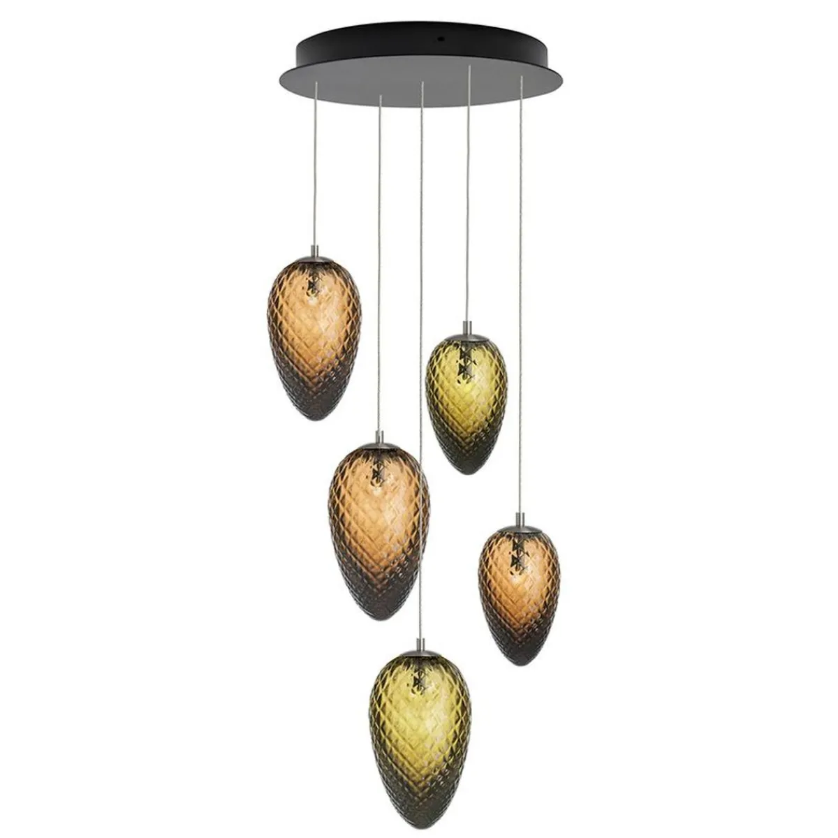 Inneholder 5 munnblåste kongler i flott harmoni, i størrelsene 17cm, 21cm og 23cm i kakao og 17cm og 23cm oliven glass.