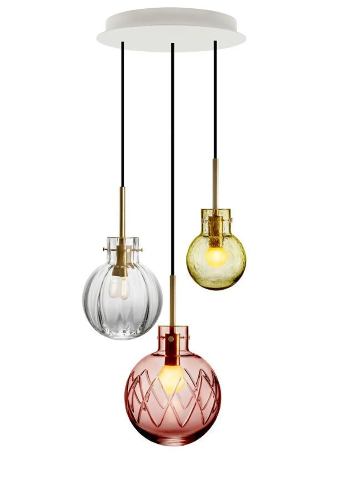 I denne kombinasjonen er det brukt følgende krystallkuler: Kryss morgenrød 200 mm, optikk klar 160 mm og soda varmgul 120 mm. Messingoppheng til 3 krystallkuler med sort tekstiltrukket kabel på 3 meter. Hvit rund takbaldakin 34cm.
