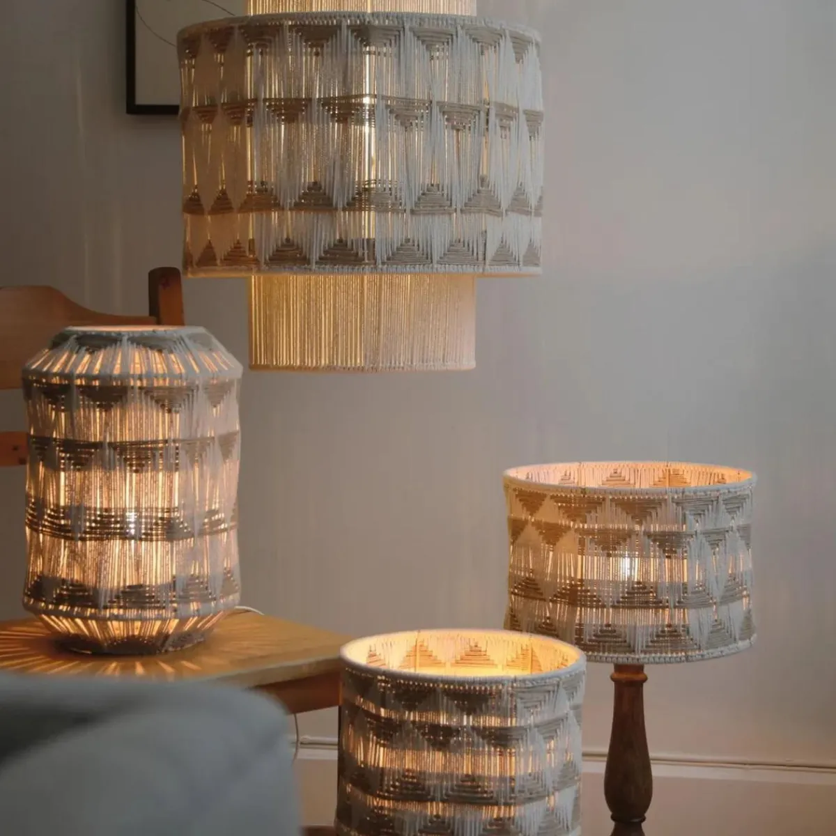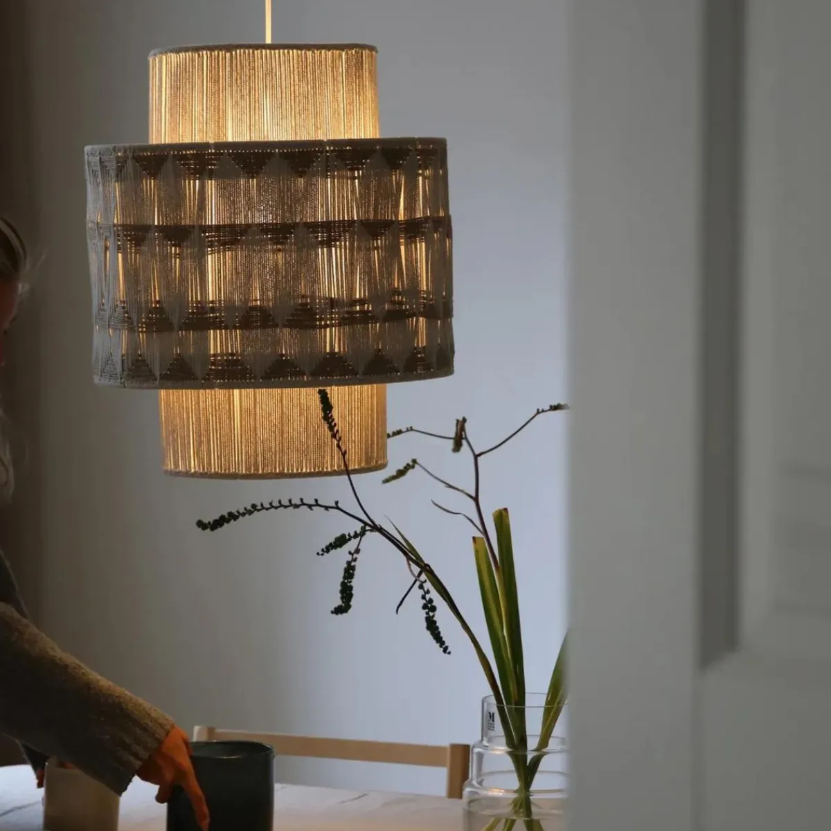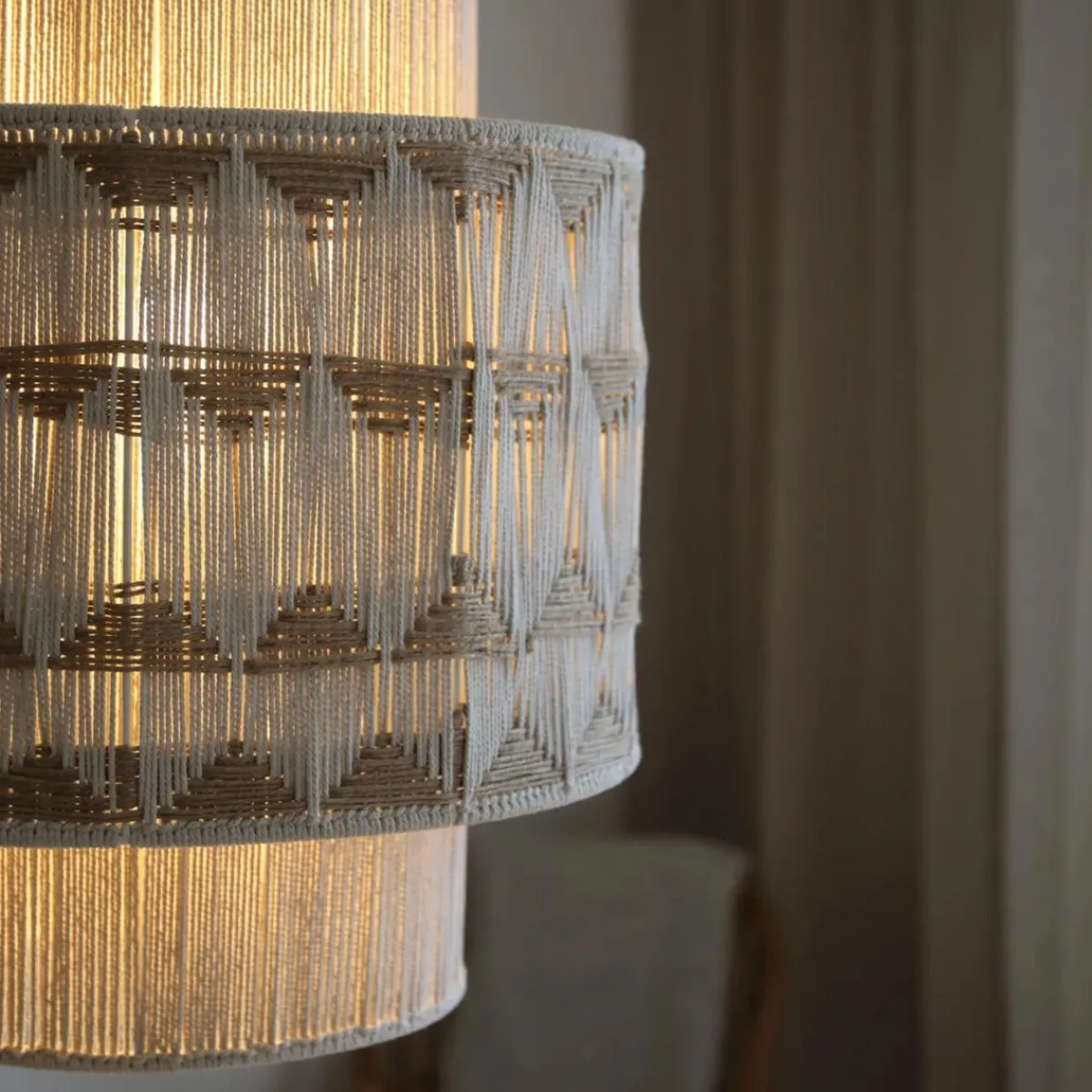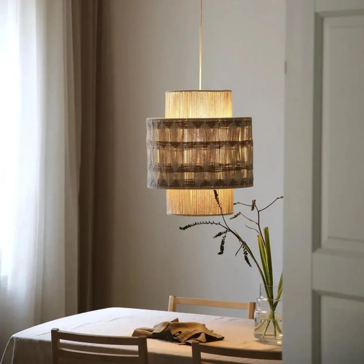 Beige makramé-håndvevd taklampe i jute og bomull som fungerer som et naturlig blikkfang i rommet. Lampeskjermen er laget med en spesiell veveteknikk, der tråder vikles for hånd rundt en jernramme – noe som gir hvert eksemplar et unikt og levende uttrykk.