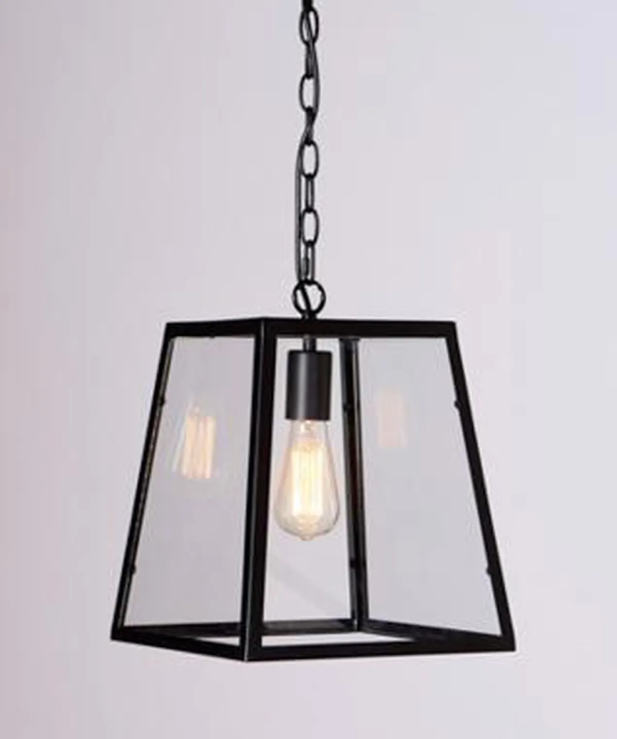 En trendy serie med sitt enkle design. Lampen har en ramme av metall med sort fargeutførelse og har skjermer av glass. Kjettingoppheng.