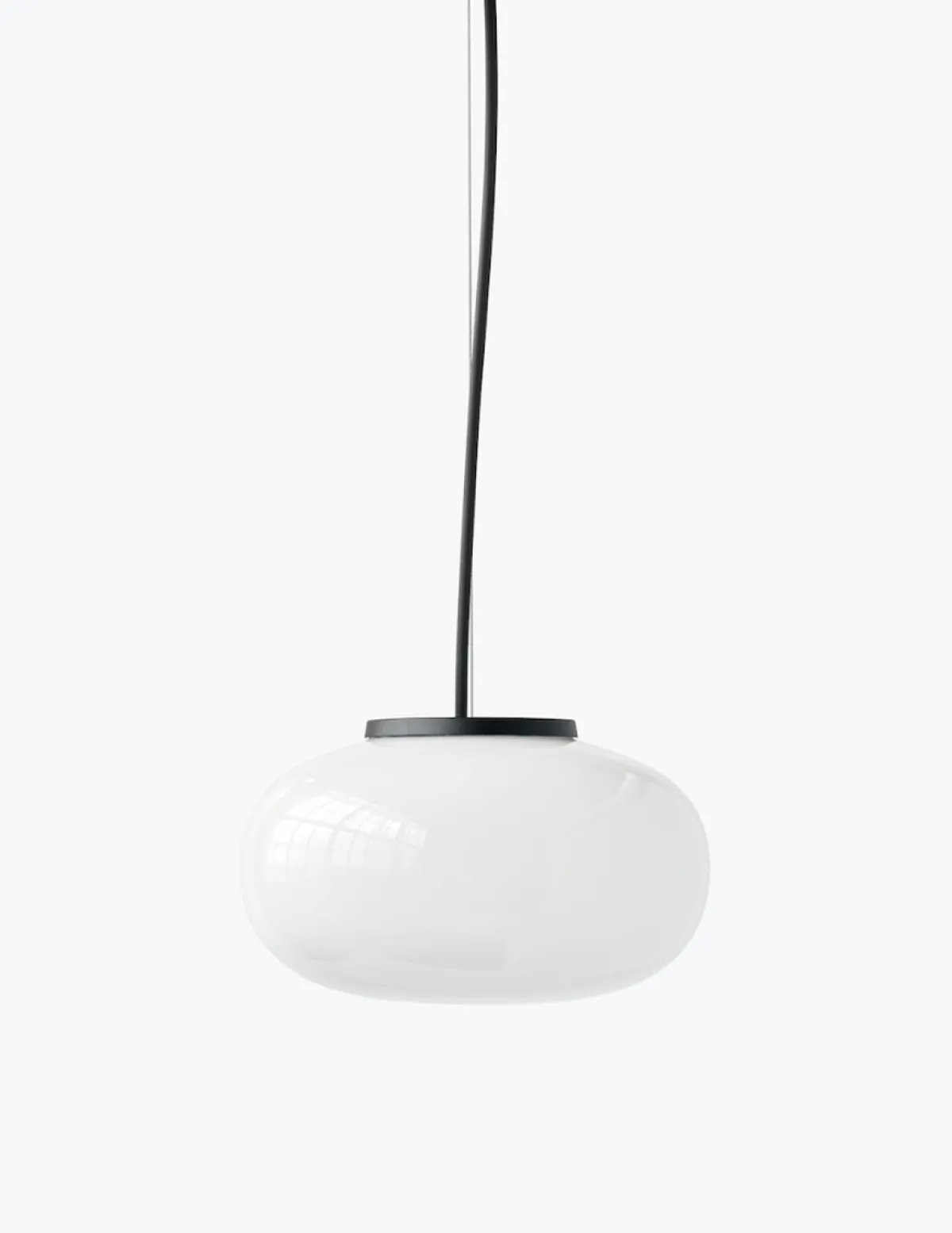 Karl-Johan pendelen fokuserer på den myke, men tydelige silhuetten av forgjengeren. Materialkombinasjonene til bord og vegglampen er fjernet, slik at den avrundede glassformen kan skinne.