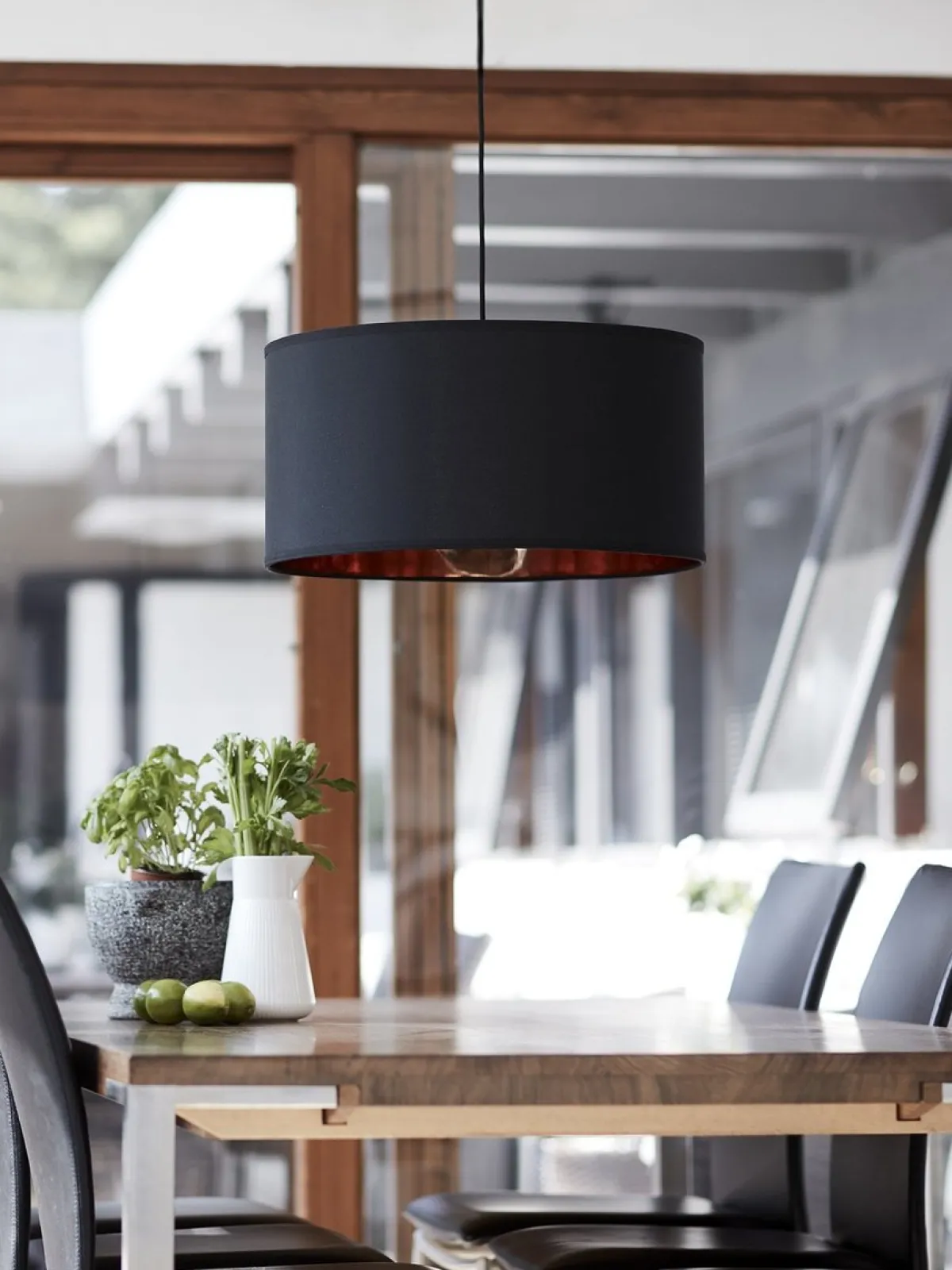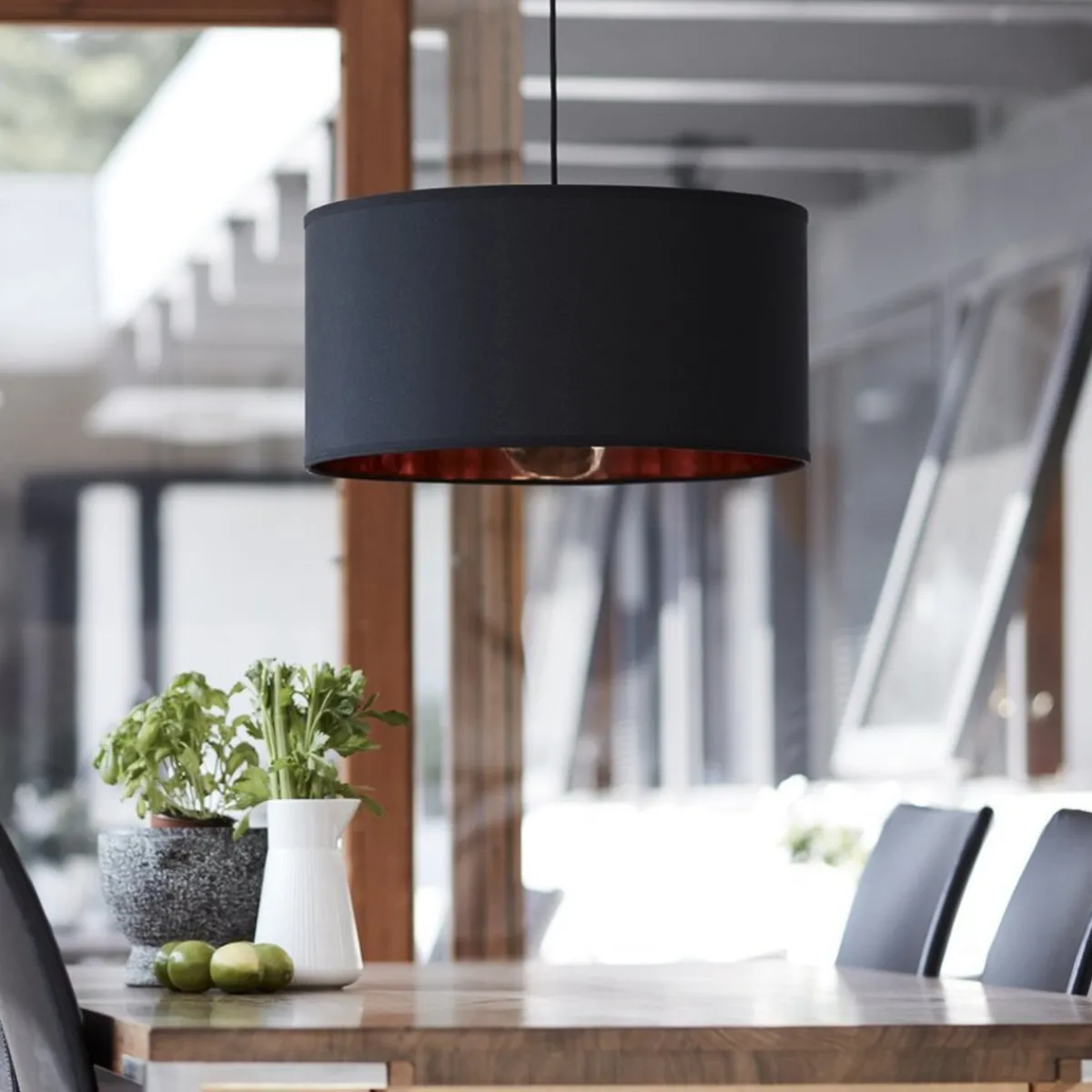 Stilfull takpendel i sort med kobberfarge på innsiden.