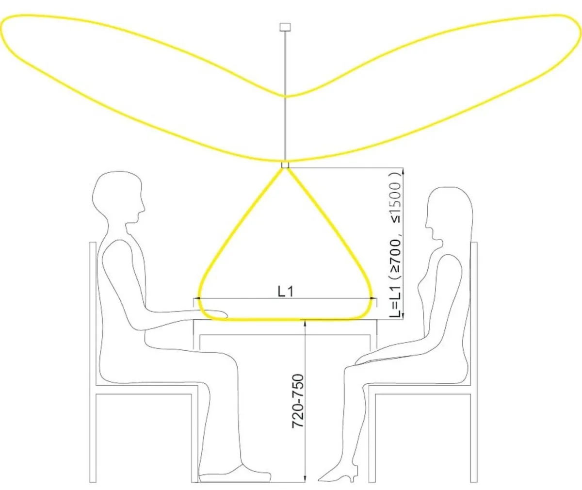 Høyde over bord / kjøkkenøy, reguleres ved å dra lampen ned / skyve den opp (heisfunksjon), for å dekke den delen av bordet som er ønskelig. Lampen er 3,5 cm bred og 3 cm høy, så den tar lite sikt i rommet.