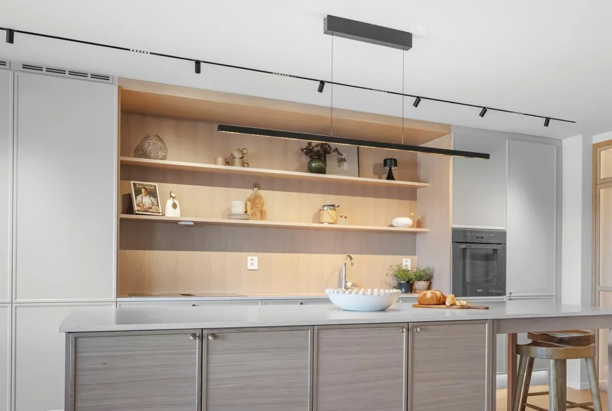 Slank og elegant pendel i langstrakt design, som passer perfekt over spisebord og kjøkkenøy. Lampen har både opp- og nedlys, sens-dim funksjon og heisfunksjon for regulering av høyden.