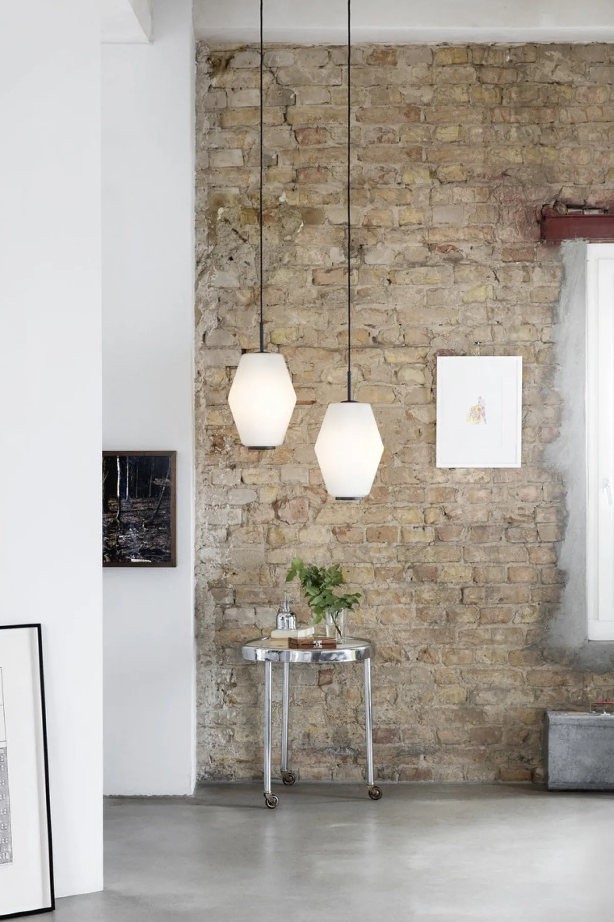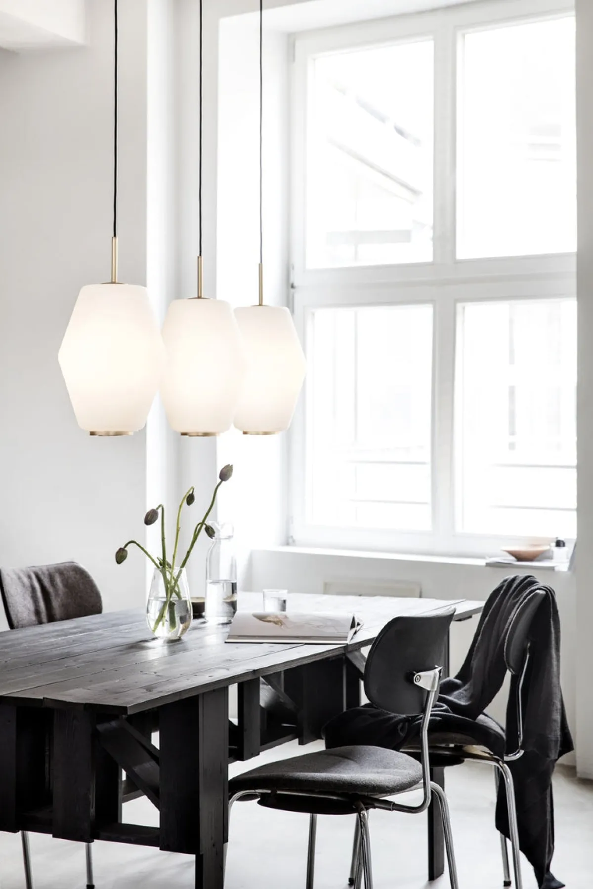 - Stål, opalhvitt glass og messing detaljer