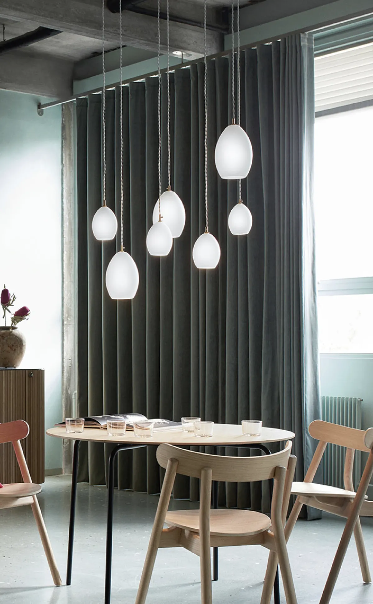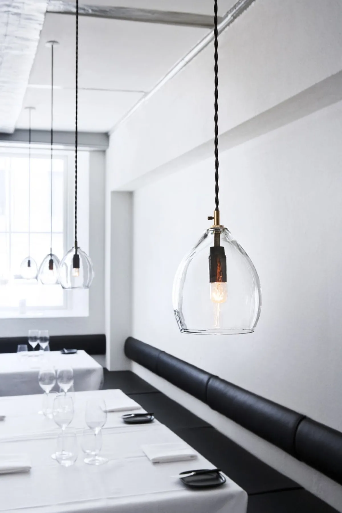 Unika pendlene ble designet i 2012 av designduoen Anne Louise Due de Fønss & Anders Lundqvist. Nydelig munnblåst glass, messingdetaljer og sort tekstilledning. Fin å bruke alene eller sammen med flere. Gir generell belysning.