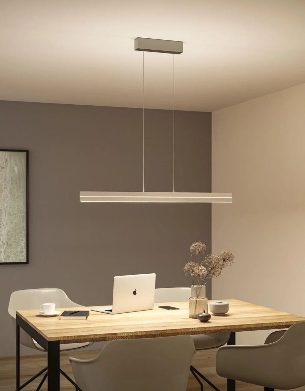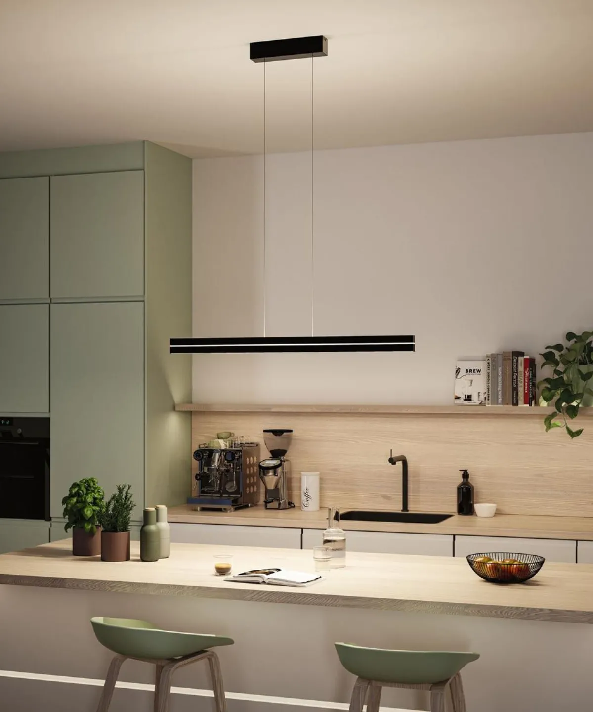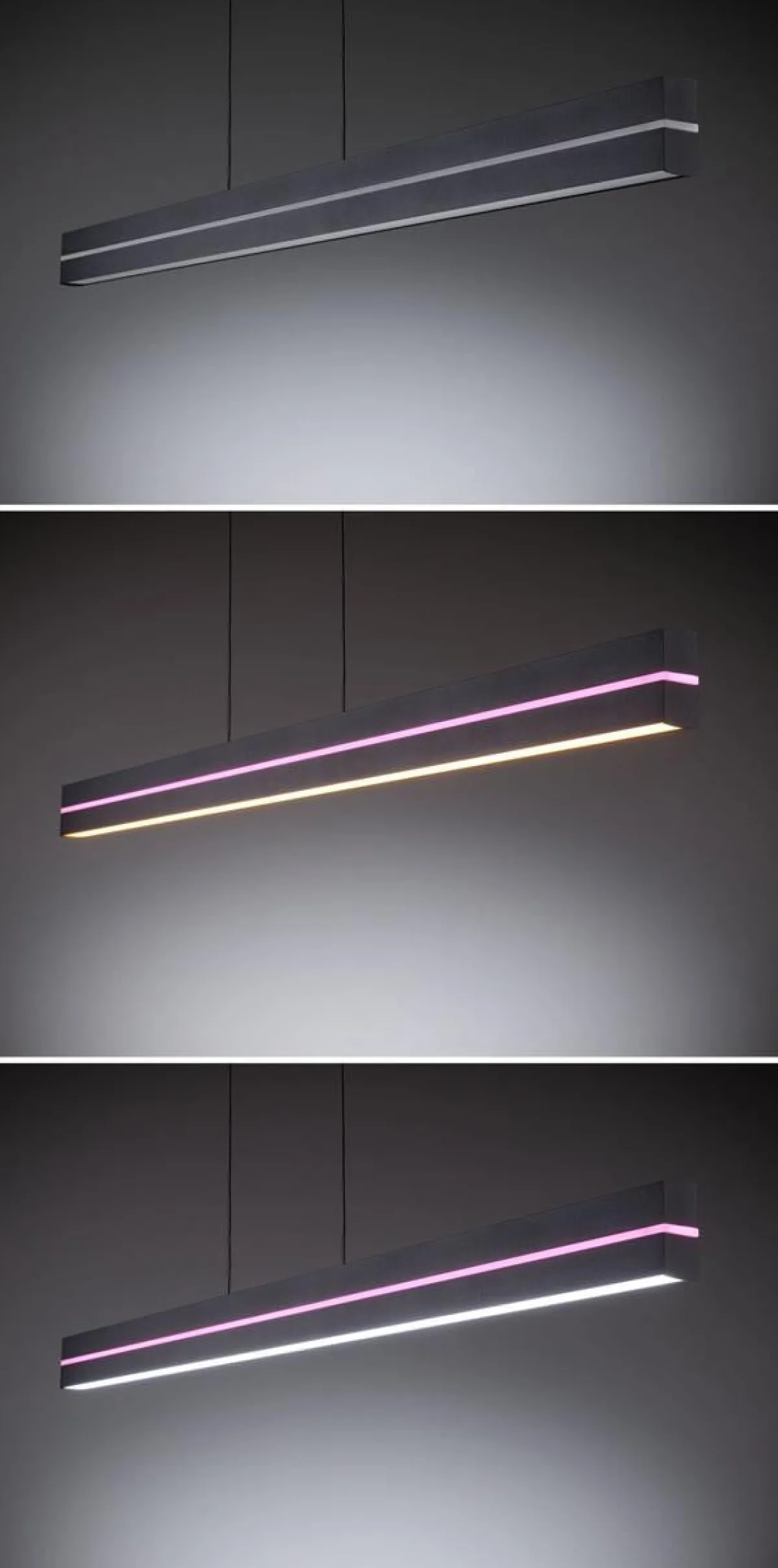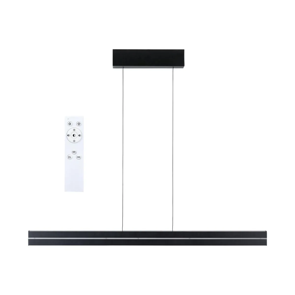 Raiko pendelarmatur er et godt valg for å lyse opp spisebordet, kjøkkenbenken eller hjemmekontoret. Den separat styrte lysutslippet oppover eller nedover sikrer maksimal fleksibilitet når du skaper den perfekte lysatmosfæren. Lysutslippet oppover kan stilles inn til å lyse permanent i bare én farge, eller for å skape flerfargede lyseffekter. Den smale lyslisten kan styres sammen med lysutslippet oppover for å skape en ekstra dekorativ aksent. I tillegg til iøynefallende lysscenarier med farger, kan du også velge et enkelt varmhvitt lys (3000K) for en innbydende atmosfære. Den intelligente Tunable White-lyskontrollen muliggjør trinnløs dimming eller justering av lysfargen som sendes nedover – fra avslappende varmhvitt til dagslyshvitt arbeidslys (2700–6500K). Den integrerte minnefunksjonen lagrer den sist valgte innstillingen til armaturen slås på igjen. Armaturen leveres med en fjernkontroll for separat styring av de to lysutslippene. Det minimalistiske designet til pendelarmaturen i svart vil sømløst gli inn i en rekke interiørstiler. Pendellampens høyde justeres enkelt med «Easy Up and Down»-prinsippet uten behov for verktøy, ved ganske enkelt å justere lengden på den slanke kabelen.