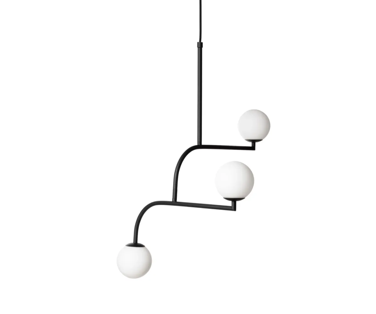 Thinking of the typical New York balcony racks in black metal and the round streetlights on Brooklyn Bridge. Those ingredients resulted into a pendant lamp where 3 equal parts are linked on each other. Turning each part makes it look like a mobile. The wall lamp and table lamp in the same collection are minimalistic.