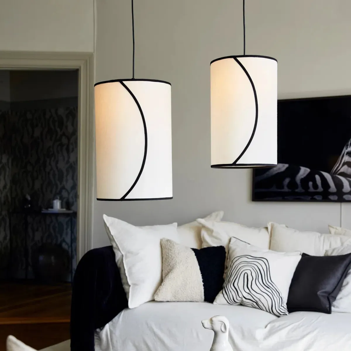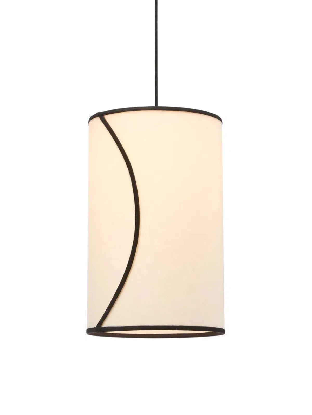 Pendel Ava. En sylinderformet pendelskjerm i økologisk bomullsstoff med hvit innside, de rene sorte detaljene gir lampeskjermen et moderne utseende. Når den er tent vil den gi et behagelig lys samtidig som den er et blikkfang. Diameter 30 cm, høyde 45 cm. E27 toppbeslag. Sort ledningssett følger med og er 1,2 meter langt med E27-brakett.