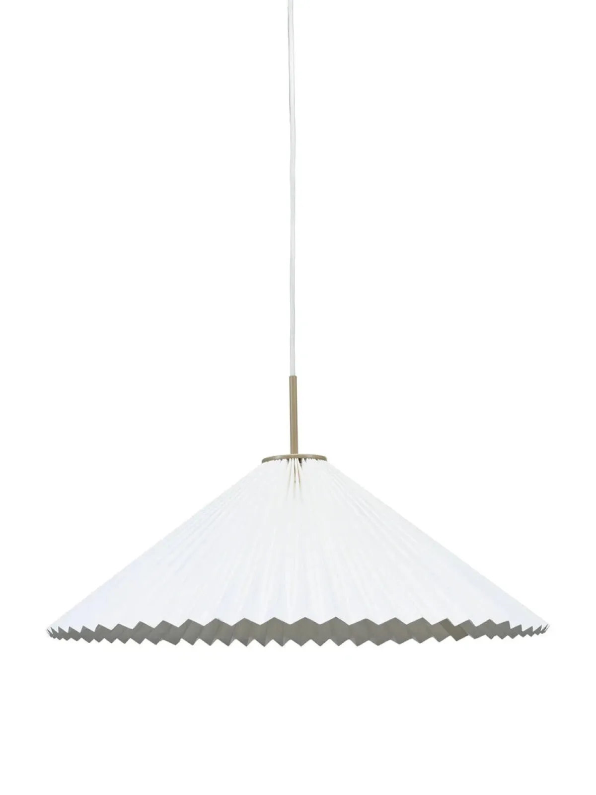 Taklampe Dora med 2m hvit tekstilkabel og lampeskjermen er laget av hvitt papir. Takkopp og lampeholder i beigelakkert metall. Lampen leveres med 1 stk E27 lampeholder, klargjort for ujordet tilkobling og krokoppheng til eksisterende takkontakt. Lampeskjermen er 60 cm i diameter. Lyskilde og takkontakt medfølger ikke.