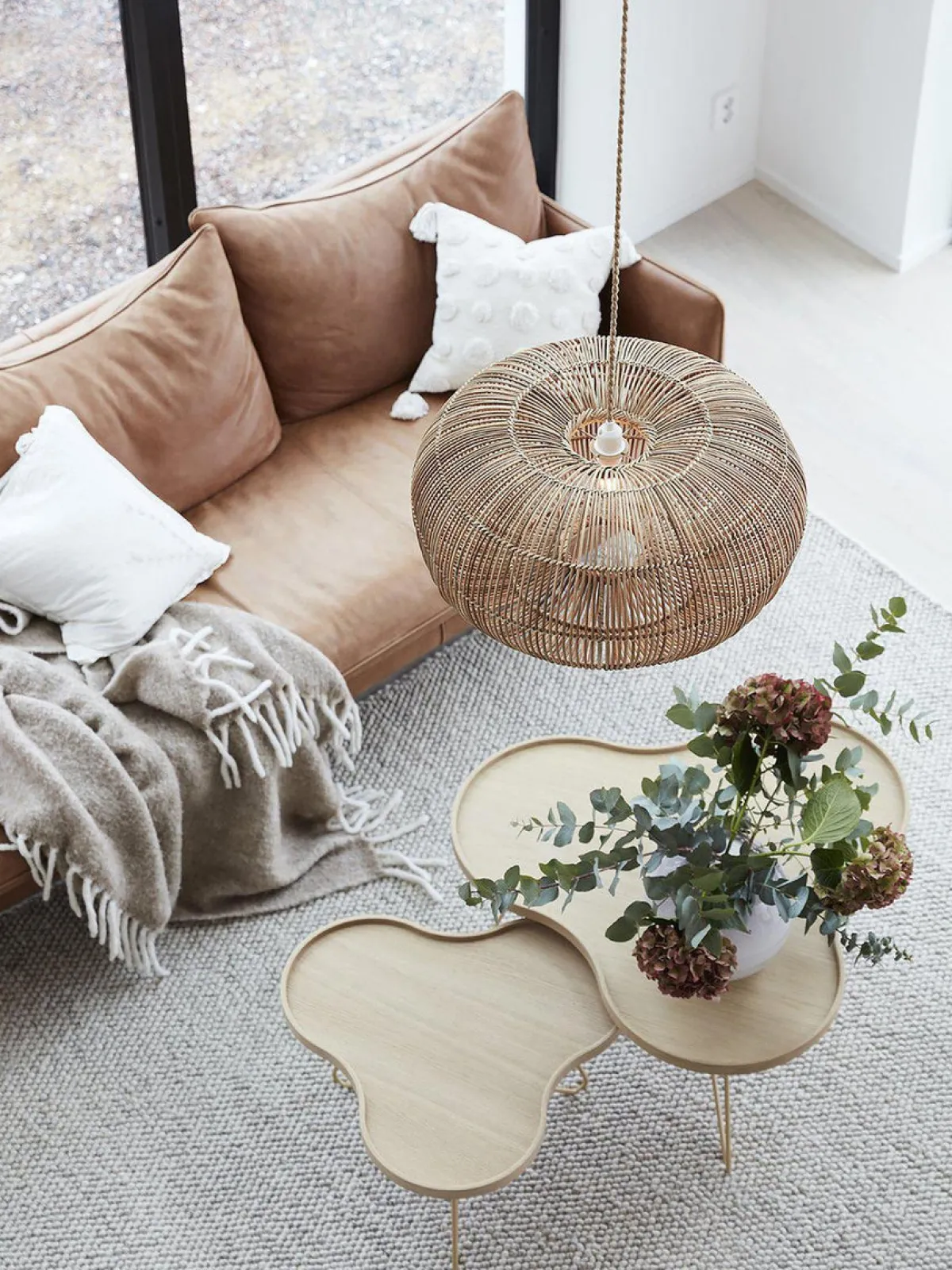 Zuri taklampe i håndflettet naturrotting. Skjermen er laget av formet rottingtråder som er vakkert flettet sammen og gjør hver skjerm unik. Skjermen har en organisk form som skaper en behagelig atmosfære. Siden den er laget av naturmaterialer kan det være mindre størrelsesavvik og fargen kan endre seg over tid. Lampen har en tvinnet jutefarget tekstilledning.