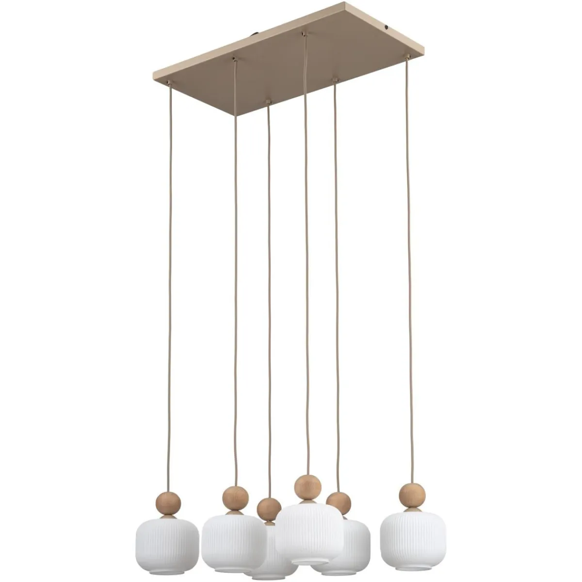 BALLO- lampefamilien er en elegant belysningskolleksjon som kombinerer moderne stil med naturlige aksenter. Et særegent trekk ved serien er de riflede, melkehvite glassskjermene, som subtilt diffunderer lyset og skaper en koselig atmosfære i ethvert interiør. Dekorative trekuler plassert over skjermene gir også et varmt og organisk preg. Det hele kompletteres av en Beige-farget baldakin – en lys, sandbeige som perfekt utfyller lampenes delikate form. BALLO- kolleksjonen er tilgjengelig i flere versjoner, noe som gjør den enkel å tilpasse til ulike rom og designbehov.