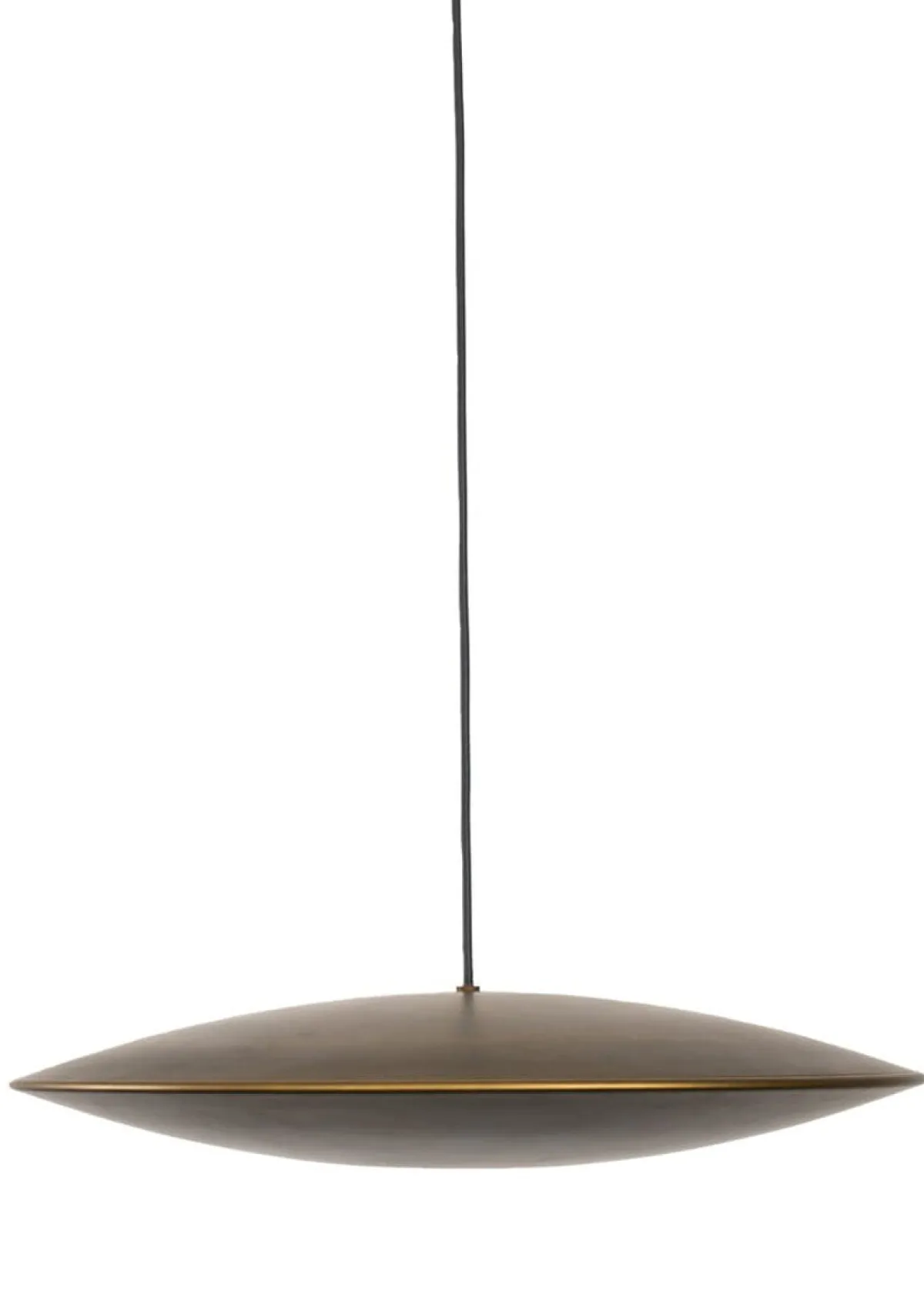 Taklampe i metall med sort tekstilkabel.
