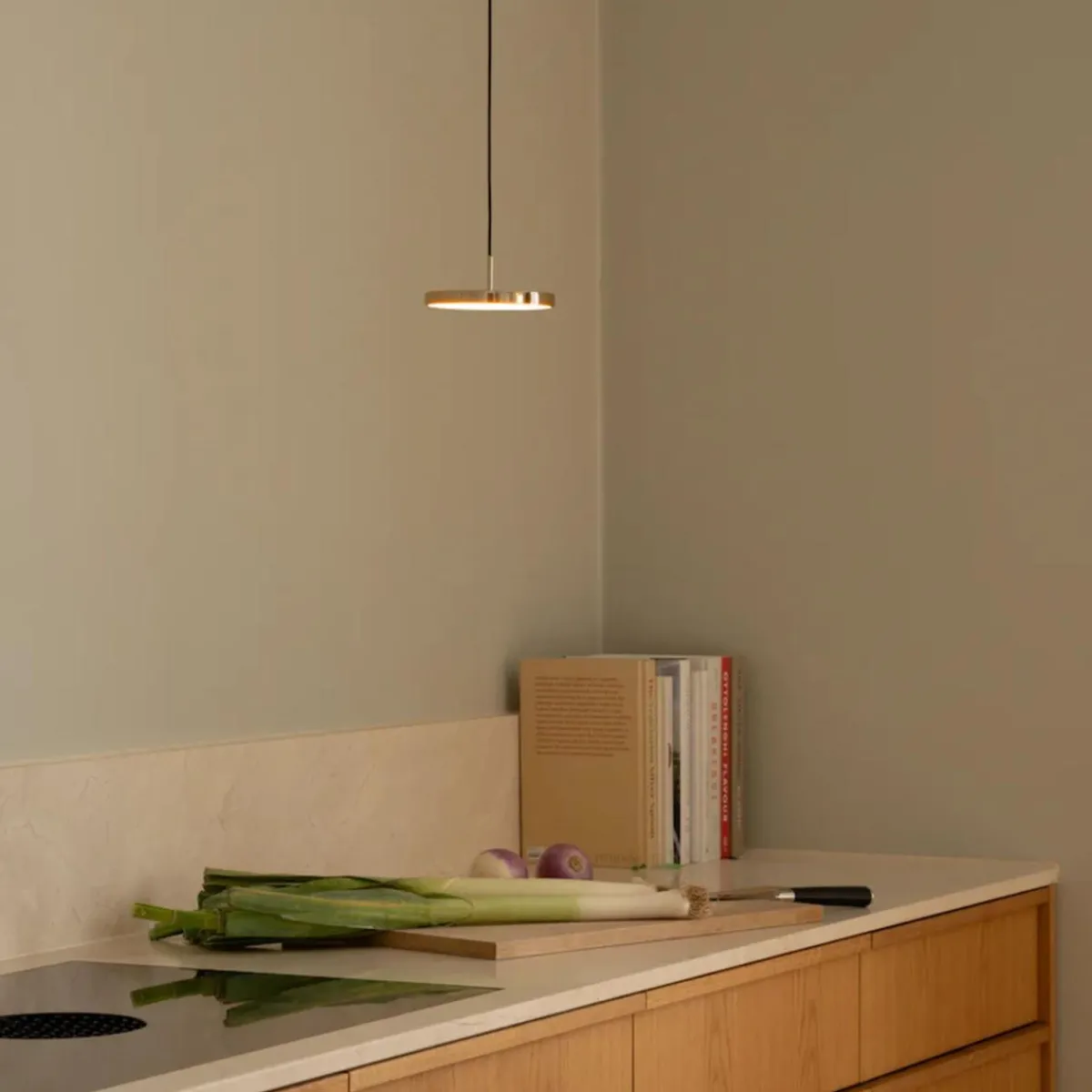 Lampens uttrykk er enkelt, minimalistisk og klassisk, noe som gjør den perfekt til alle omgivelser. Heng Asteria Micro alene eller flere sammen over kjøkkenbenken for å få praktisk belysning når du lager mat med familie og venner.