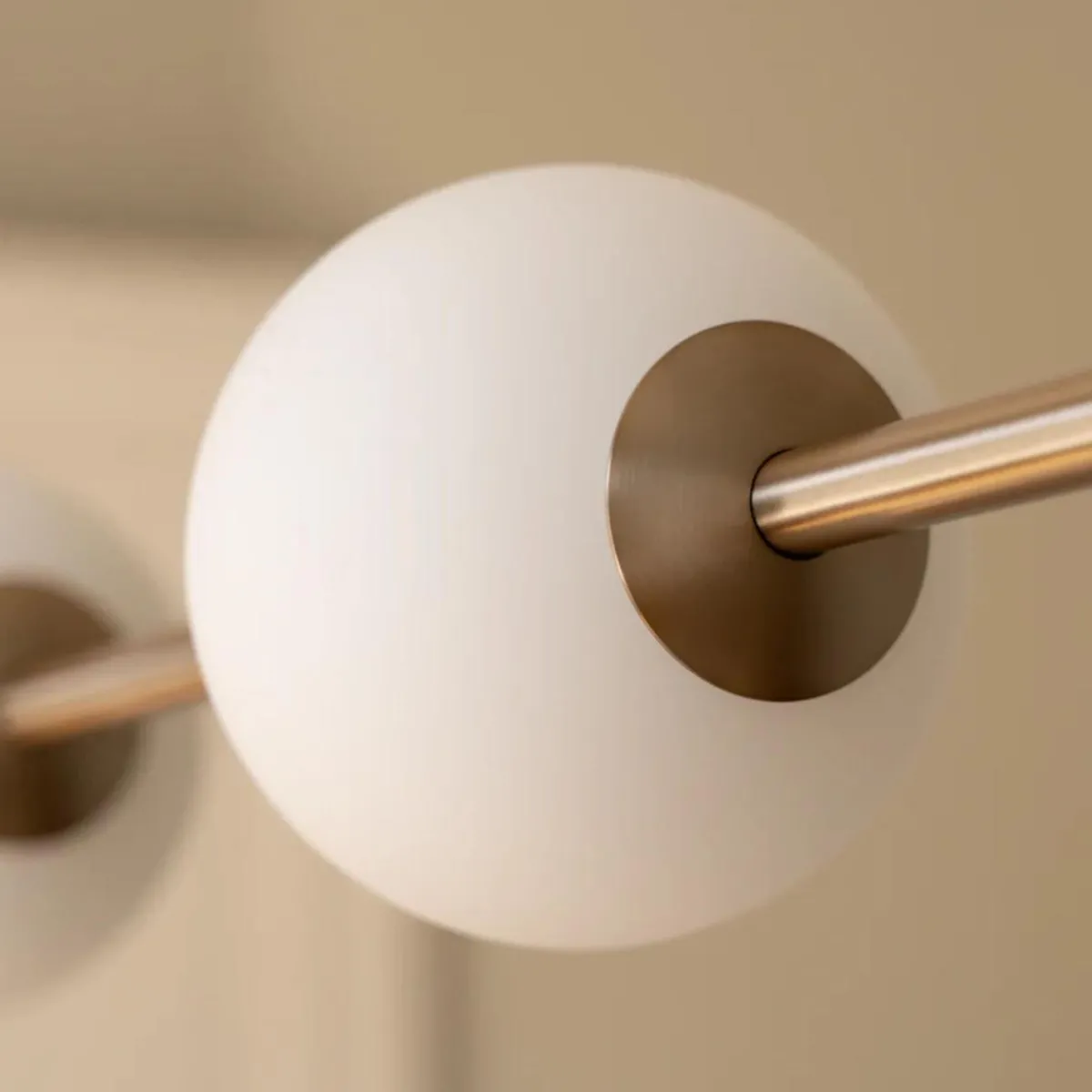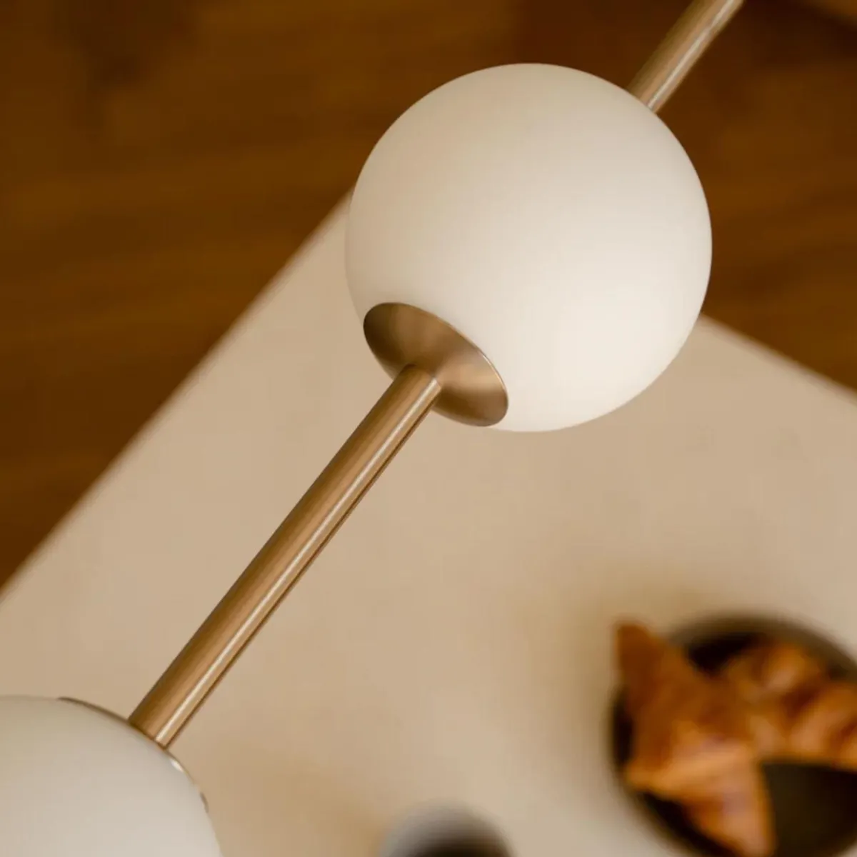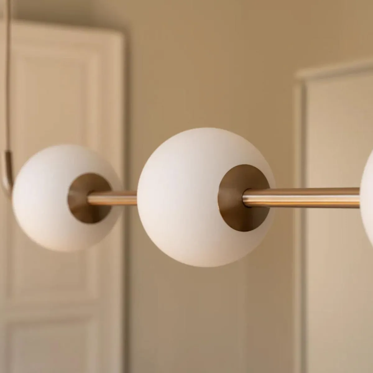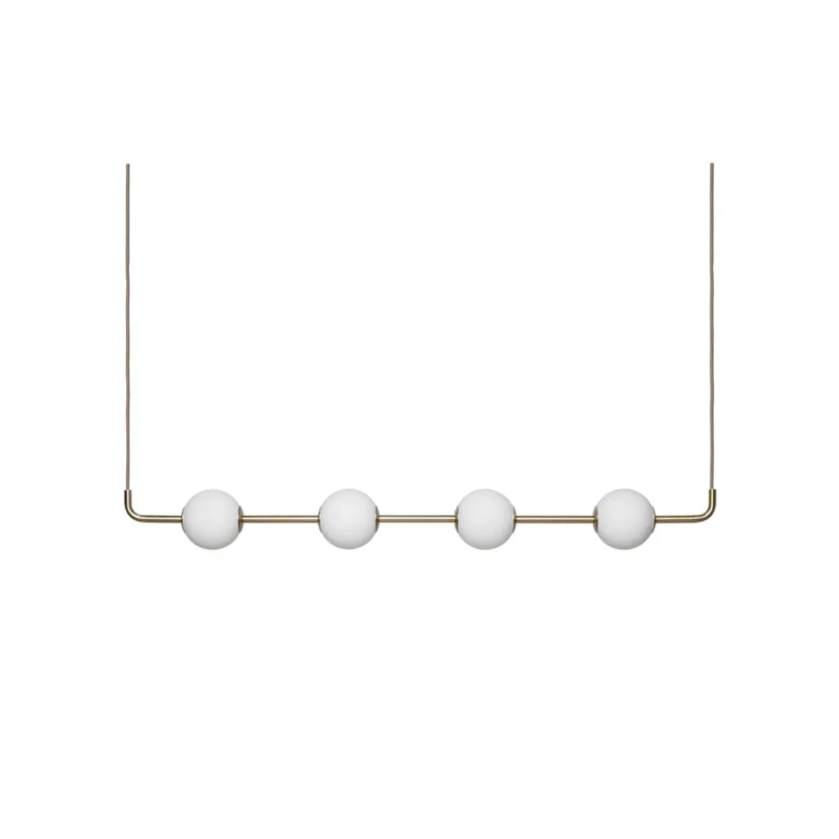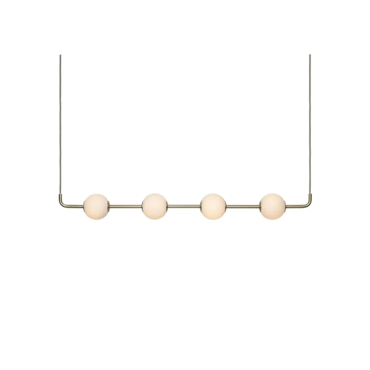En skulpturell pendellampe med lysende glober som henger som perler på en kjede – Audrey Linear forener myke kurver, munnblåst opalglass og elegante metalldetaljer. De fire jevnt plasserte globene sprer et varmt og innbydende lys over spisebord, kjøkkenøyer og arbeidsområder, mens ledningene integreres diskret i designet slik at lampens silhuett settes i fokus.