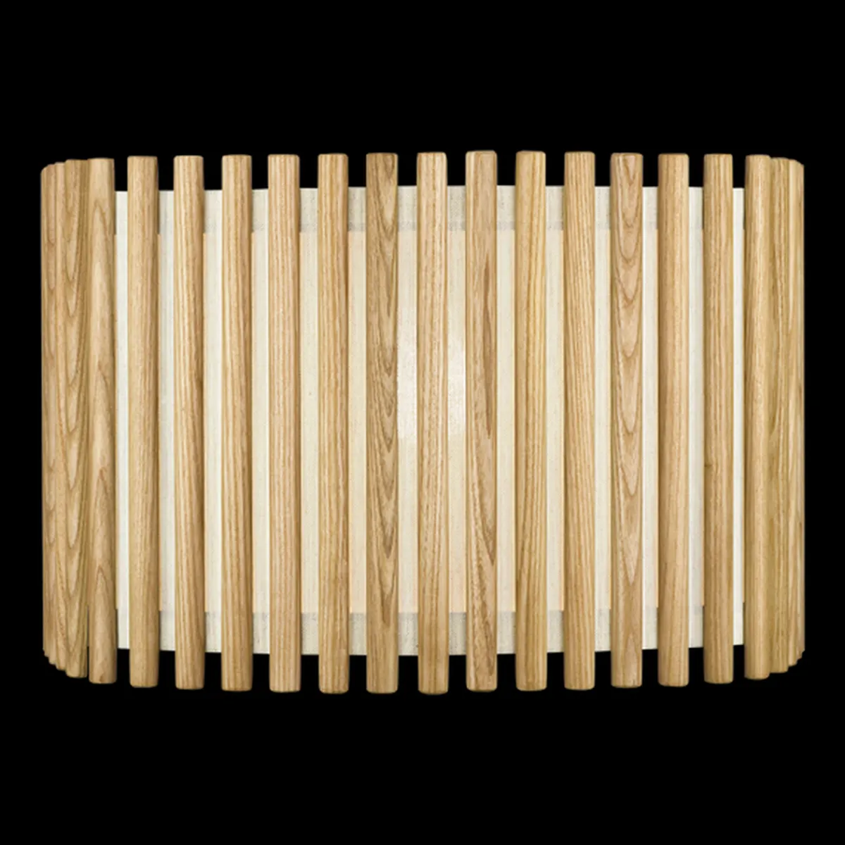 Komorebi-kolleksjonen består av flere lampeskjermer laget av trelameller og tekstil. Kombinasjonen av tredetaljer og tekstil bidrar til å jorde hjemmet og forvandler atmosfæren til en trøstende og oppløftende ro.