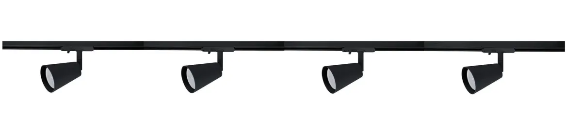 Komplett 2 meter spotskinne med 4 spotter. Lyspærer kjøpes separat med GU10 sokkel.