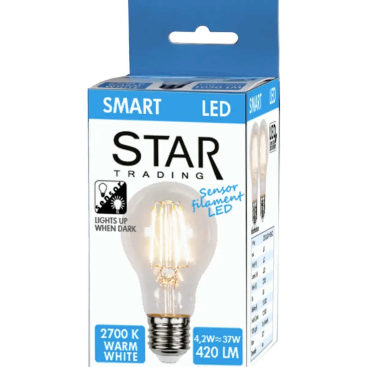 Denne dekorative LED-pæren med klart glass har skumringsgelè, det gjør at lyset automatisk tennes ved mørkets frembrudd og slukkes når det blir lyst.