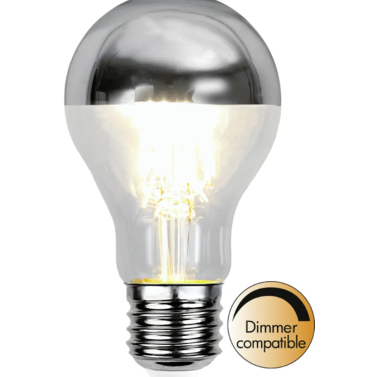 Dekorativ LED-lyspære med klart glass og forkrommet topp gir deg det tilnærmet likt lys som vår gode gamle glødepære. Også kjent som toppforspeilet.
