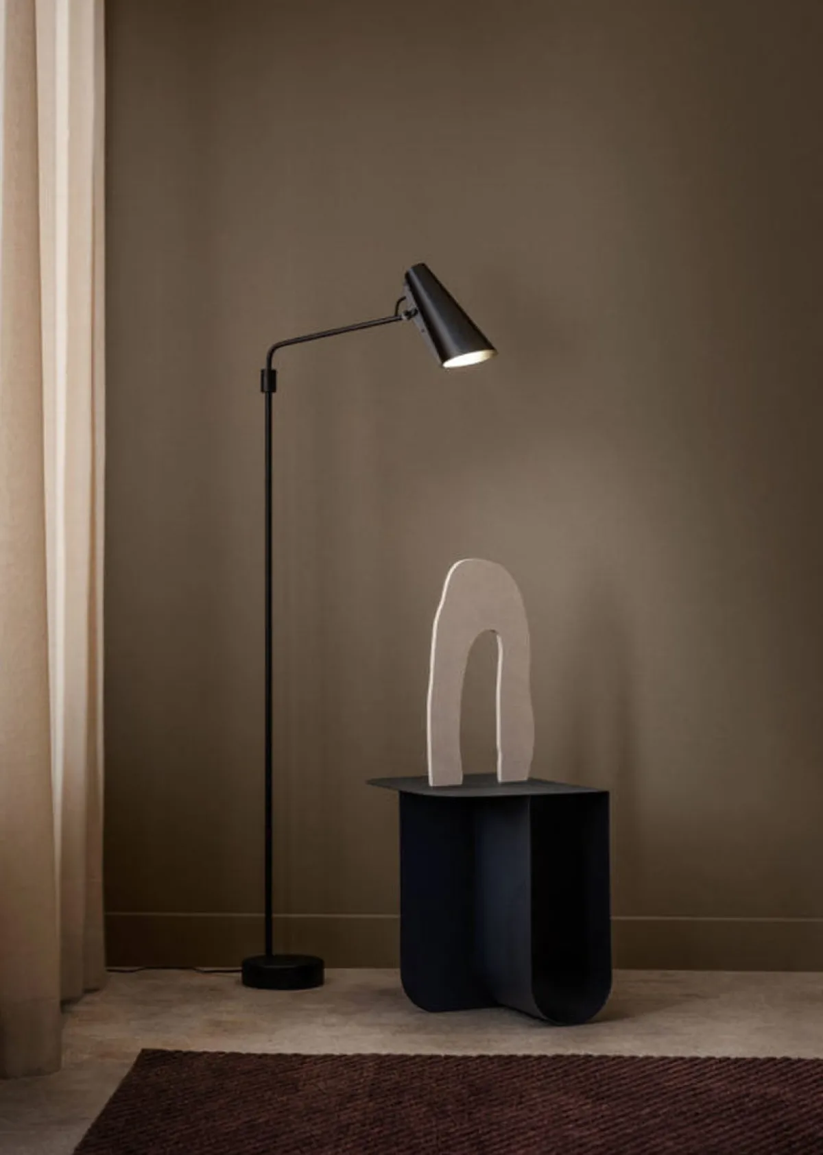 Birdy swinglampen er tilgjengelig i et utvalg av svart, messing eller stålfinish. Lampen er enkel å bruke og har en jevn roterende akse takket være stålkroppen og aluminiumsskjermen. Birdy swing finnes som gulv, bord og vegglampe.