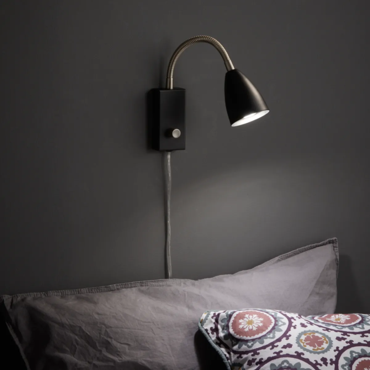 Ciro Flex-vegglampe fra Markslöjd i metall med flexarm i messingfarge. Dimmer er montert på veggplaten.