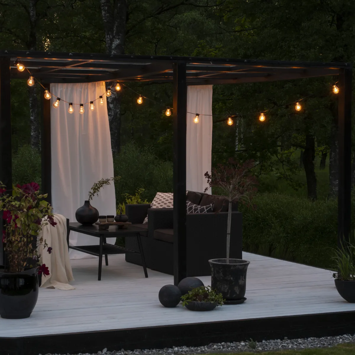 Lysslynge med 20 amber LED-lamper. Faststøpte lyspærer og kuppel i plast som gjør dem uknuselig. Det amberfargede lyset er med på å skape ekstra koselig stemning. Amber er en enda varmere lysfarge enn varmhvit, uten at den blir gul.