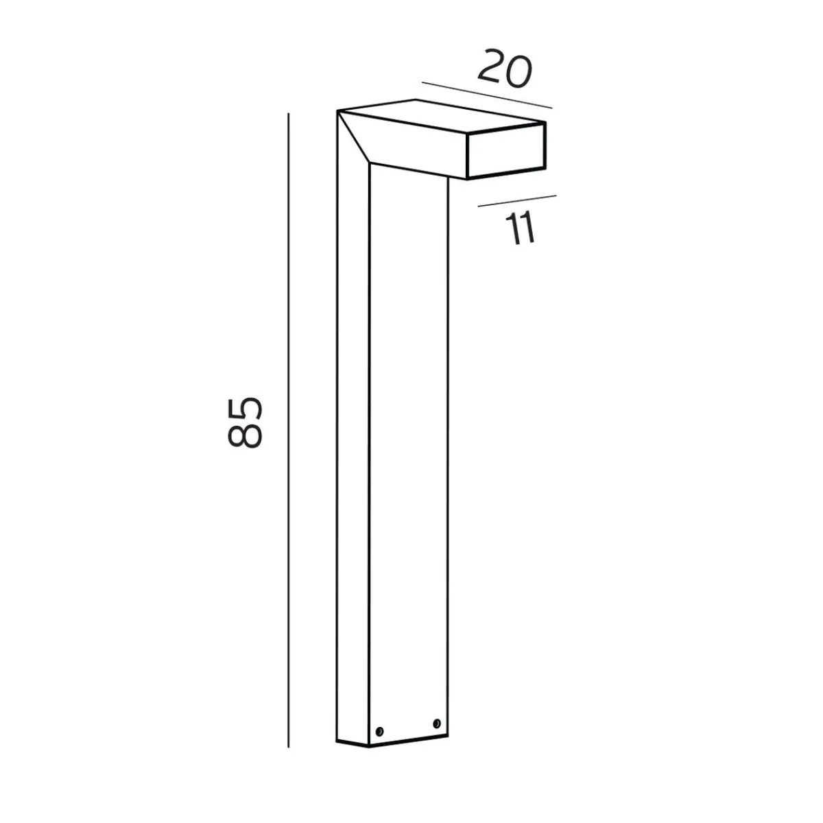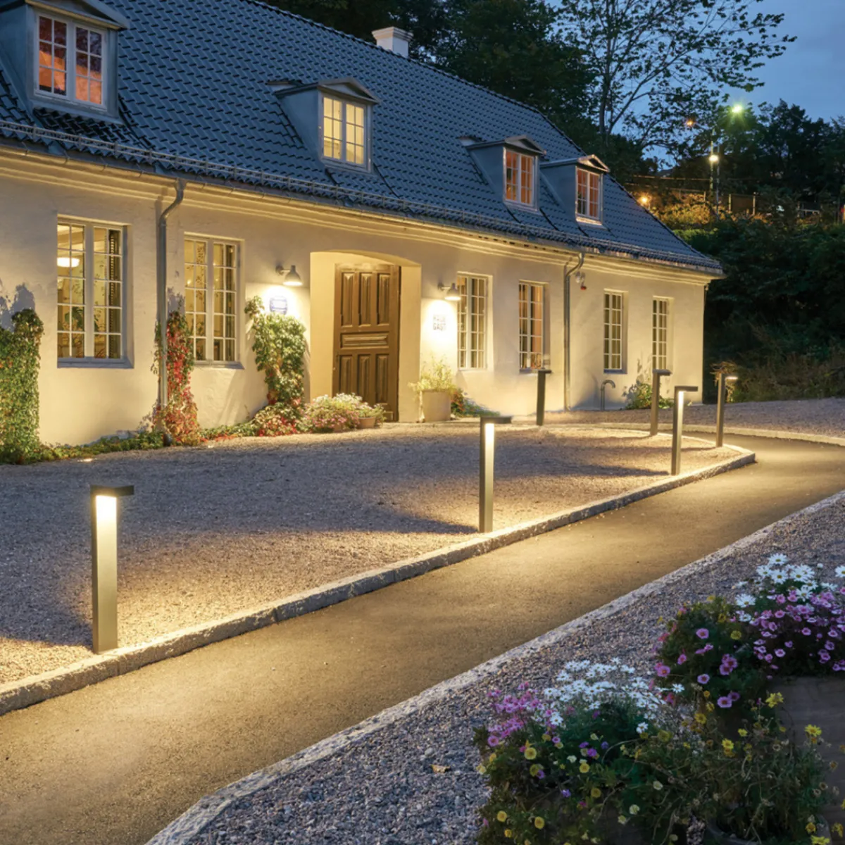 Stilren pullert i pulverlakkert aluminium. Blendfri armatur med indirekte lys.
