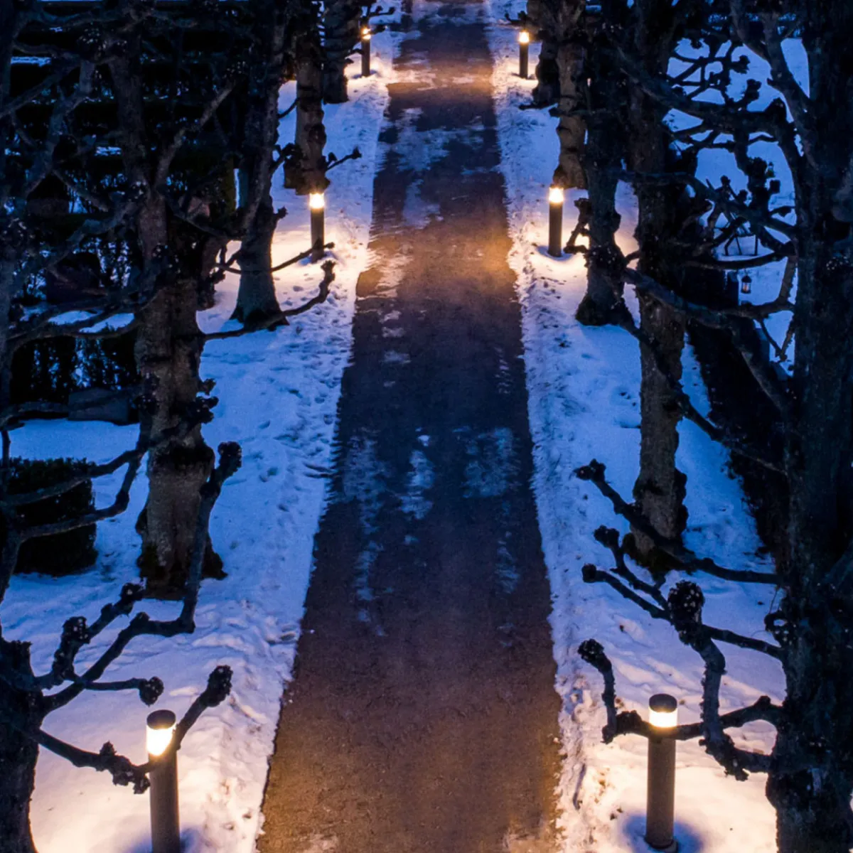 Egersund-pullert i pulverlakkert aluminium. Blendfri armatur med indirekte lys.