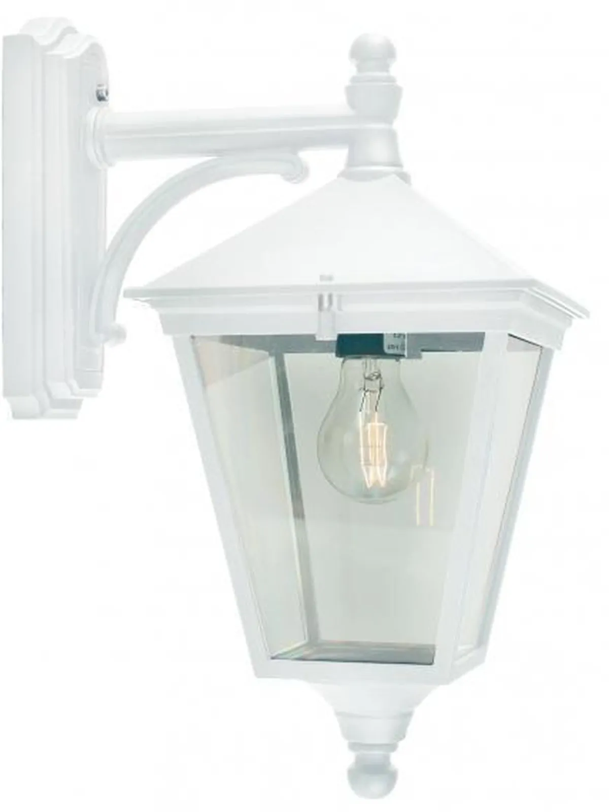 Flott utelampe i klassisk design som vender ned. Glasset er slagfast klar polykarbonat. Du behøver 1 stk lyspære med E27-sokkel til lampen.