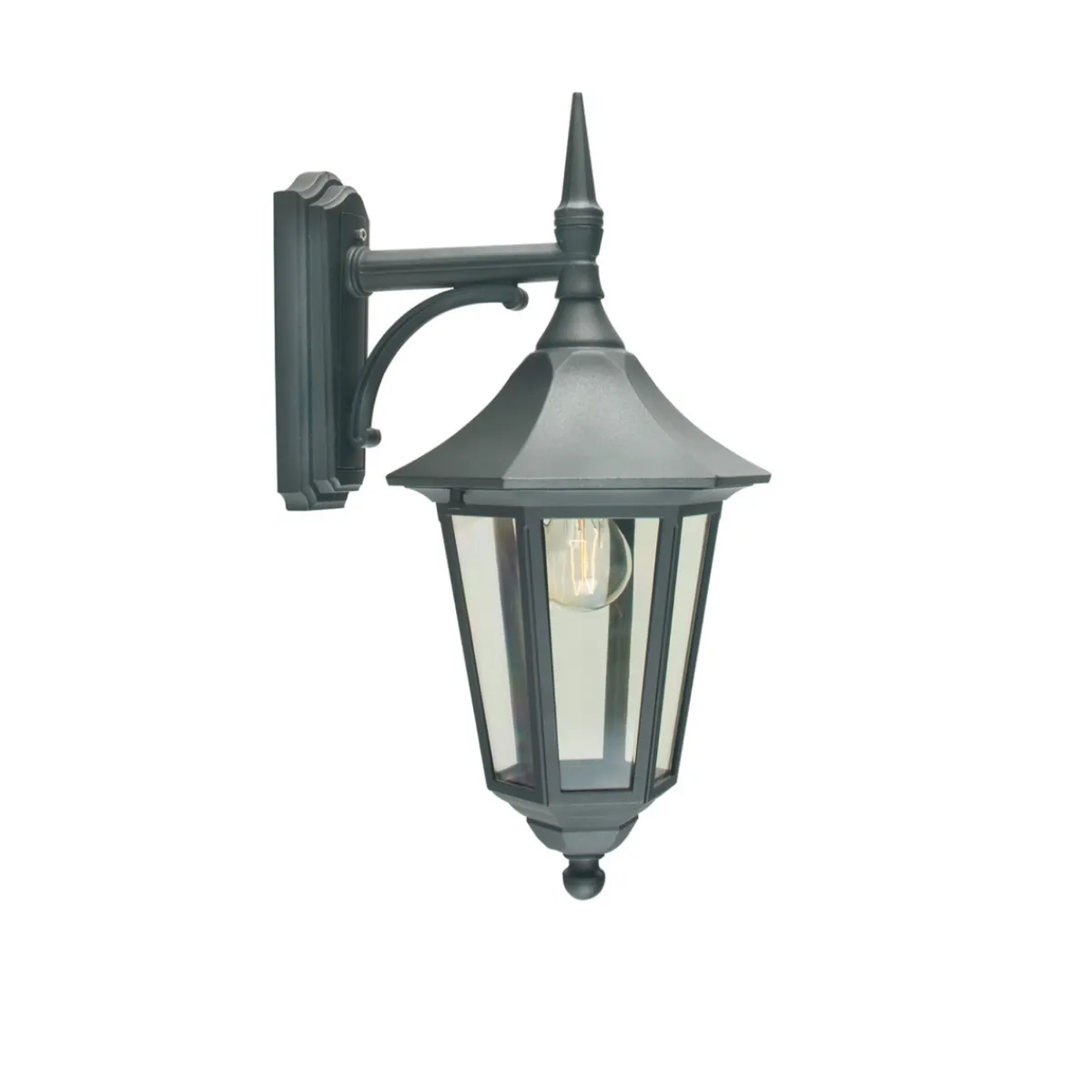 Vegglampe i klassisk design. Glass av slagfast klar polykarbonat. Utelampen er vendt ned.