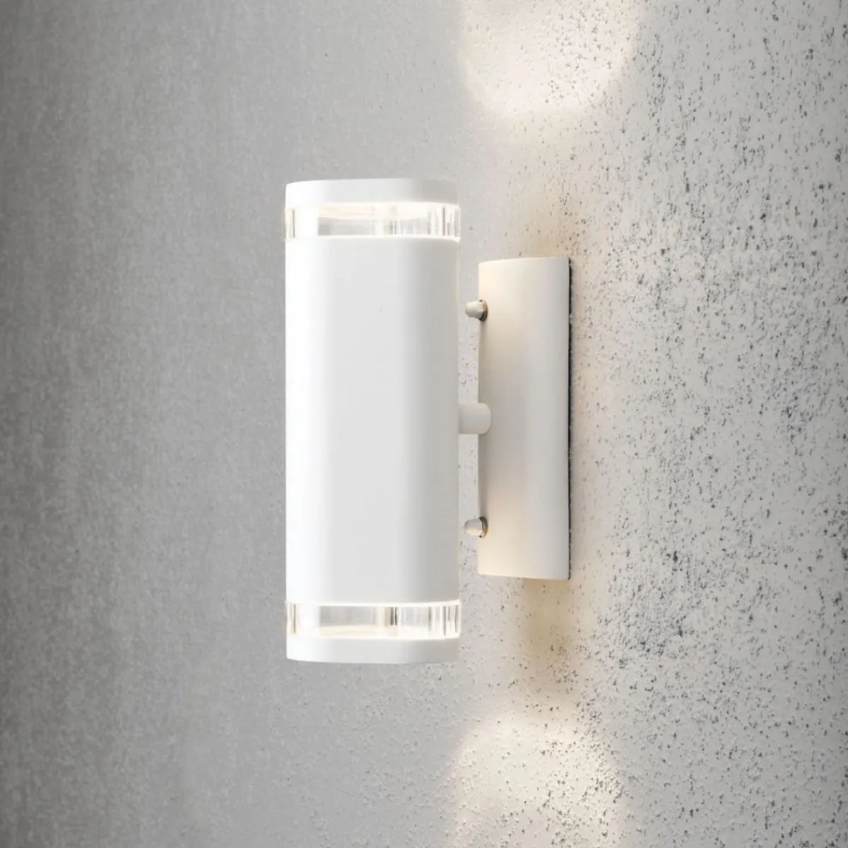 Moderne og dekorativ utelampe som lyser kraftig både opp og ned på veggen. Lampen er en del av en lampe-serie som finnes i flere varianter.