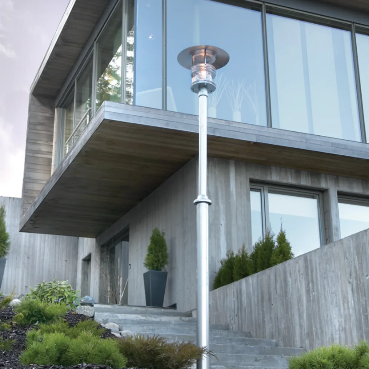 Stolpelampen leveres i fargene galvanisert stål og sort.