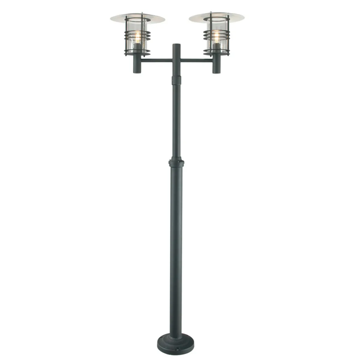 Stolpelampen leveres i fargene galvanisert stål og sort.