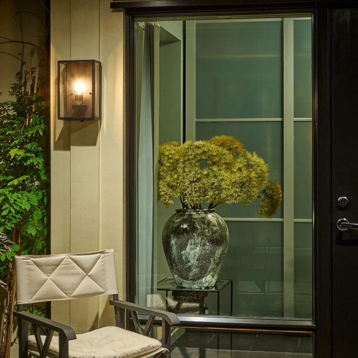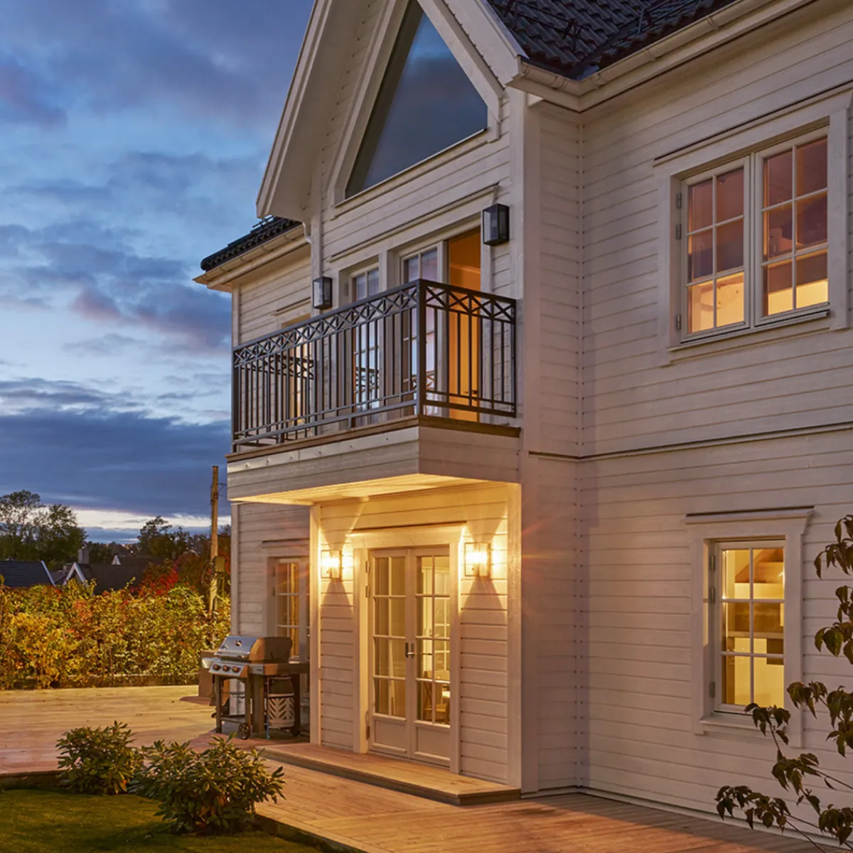 Stilren lampe i stål med klart glass som passer godt til det tradisjonelle og moderne huset.