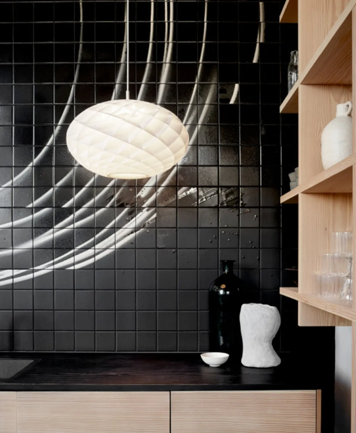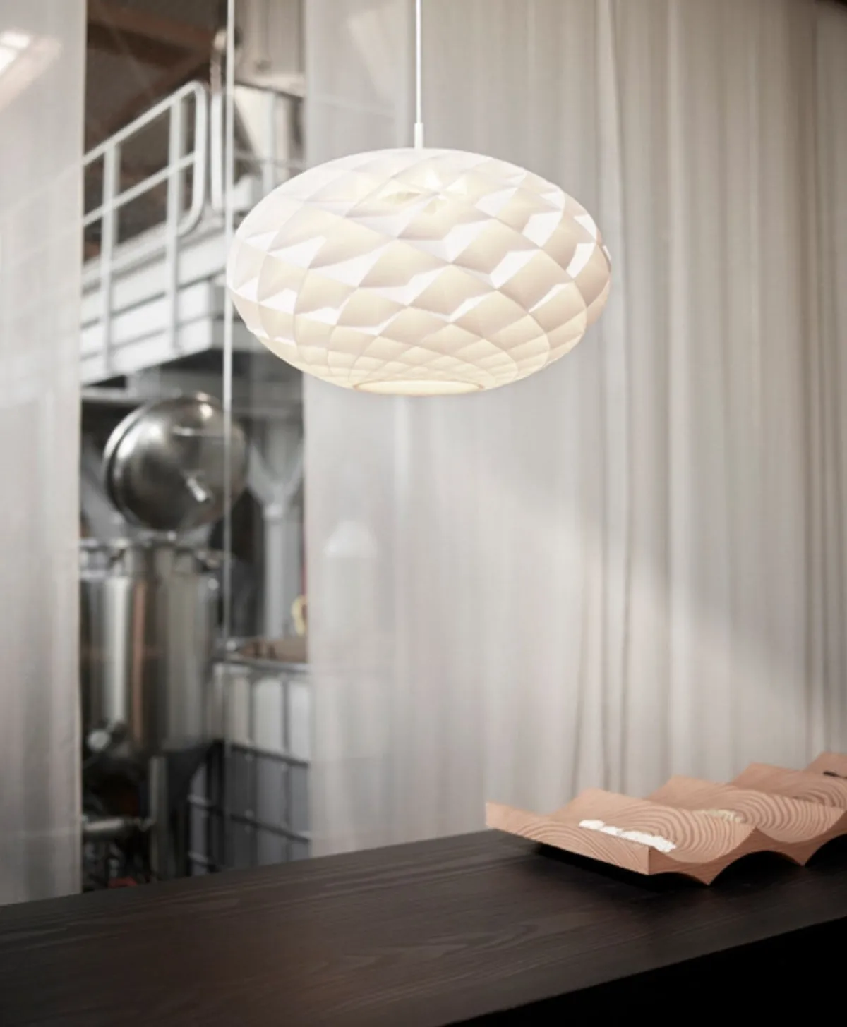 Patera pendelen er vakker å se på fra alle vinkler, lampen er bygget opp av små, diamantformede celler som er nøye designet for å reflekter blendefritt lys når de betraktes fra en vinkel på over 40 grader. Lampen avgir et 360 graders lys som bader omgivende rom i et naturlig, jevnt og behagelig lys. Under 40 grader gir lampen direkte, nedadrettet lys. Den runde åpningen under gir direkte lys med en myk overgang mot det reflekterte lyset. Pendelen kan brukes med eller uten avskjermer, avhengig av om lyskilden skaper uønsket blending eller ikke. Patera er en stemningsskapede lampe som gir et løft til ethvert rom. Patera er tidløs og følger de samme elegante designprinsippene som den sirkulære Patera og settes sammen helt for hånd, etter den matematiske strukturen til den fengslende Fibonacci-spiralen.