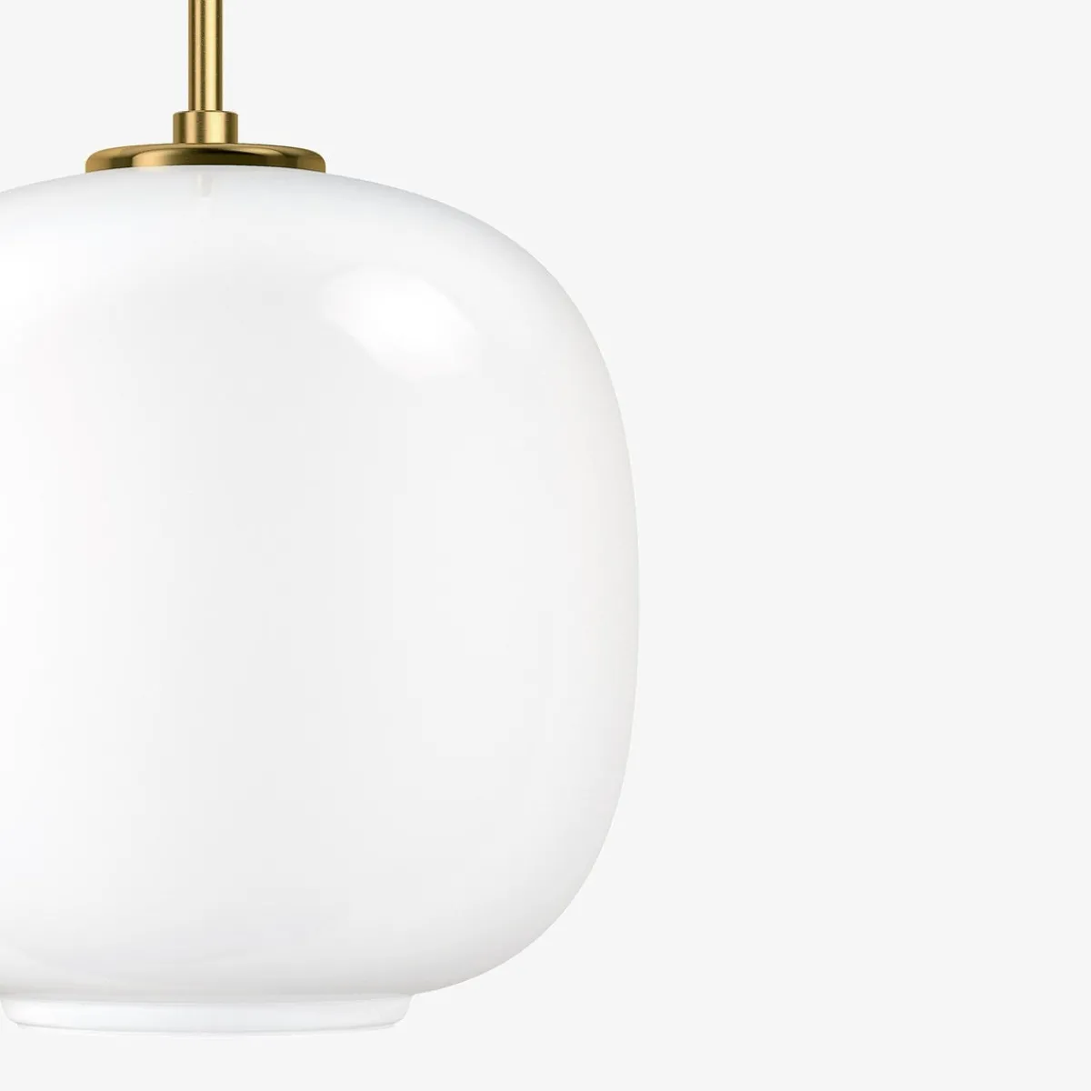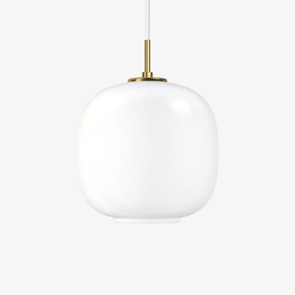 - Materiale: Skjerm: Munnblåst, polert, hvitt opalt glass. Pendelfeste: Ubehandlet børstet messing, vil patinere.