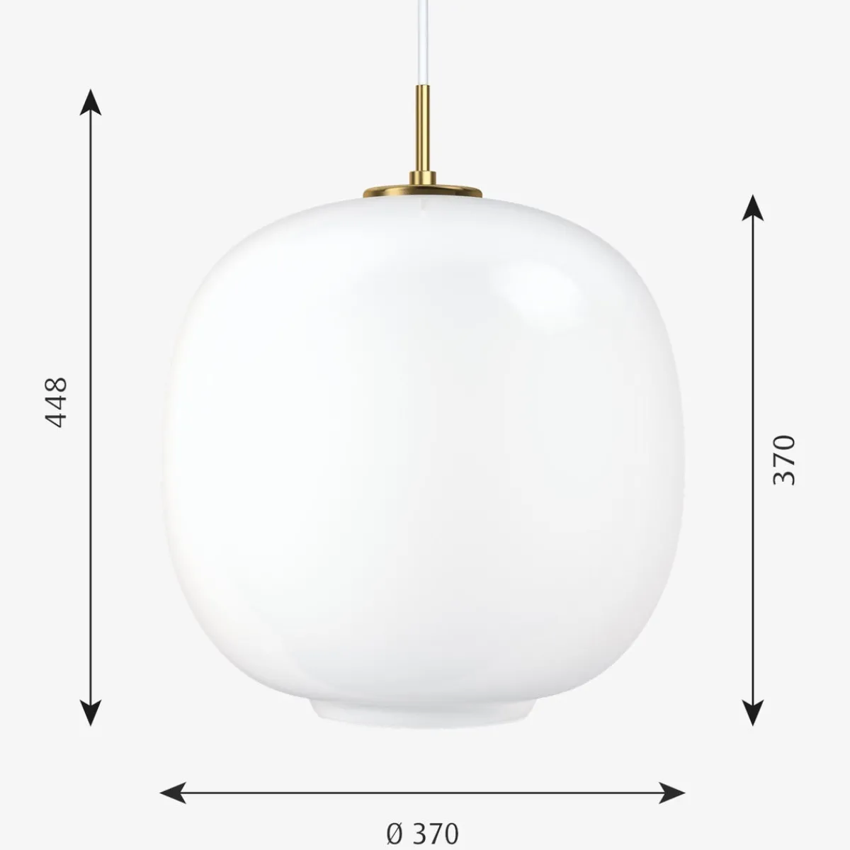 - Materiale: Skjerm: Munnblåst, polert, hvitt opalt glass. Pendelfeste: Ubehandlet børstet messing, vil patinere.