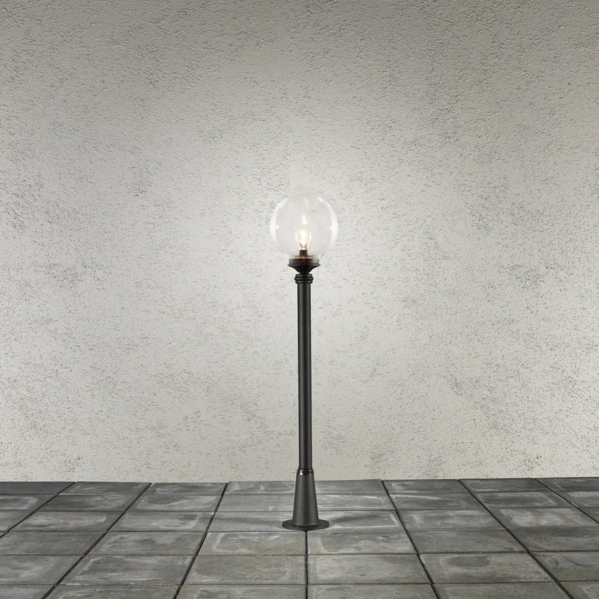 Svart Orion-lysstolpe med glasskuppel i klar farge, som passer perfekt for hage eller gangvei.
