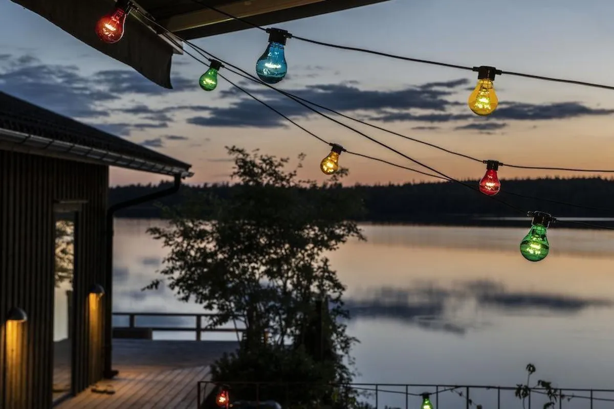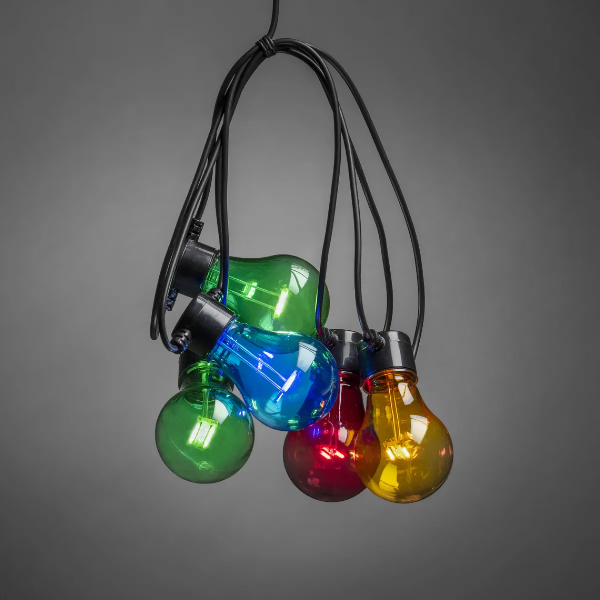 Lysslynge med 10 flerfargede LED-lamper. Faststøpte lyspærer og kuppel i plast som gjør dem uknuselig. Lysene i ulike farger er med på å skape ekstra leken, men koselig stemning.