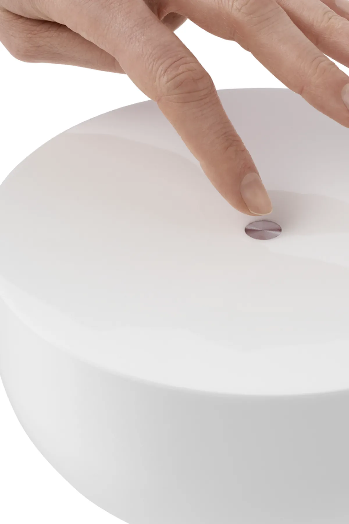 Ettersom lyset sprer seg fra hele den øvre delen av lampen, gir den lille bordlampen et høyt lysutbytte. En dreid forsenket metallsirkel på toppen av lampen tilfører en raffinert detalj til designet, og ved å banke forsiktig på sirkelen kan lyset dimmes til tre ulike nivåer. Den bærbare Kizu-bordlampen har en batterilevetid på 10 timer ved en lysinnstilling på 100 % og lades med en USB-C-kabel.