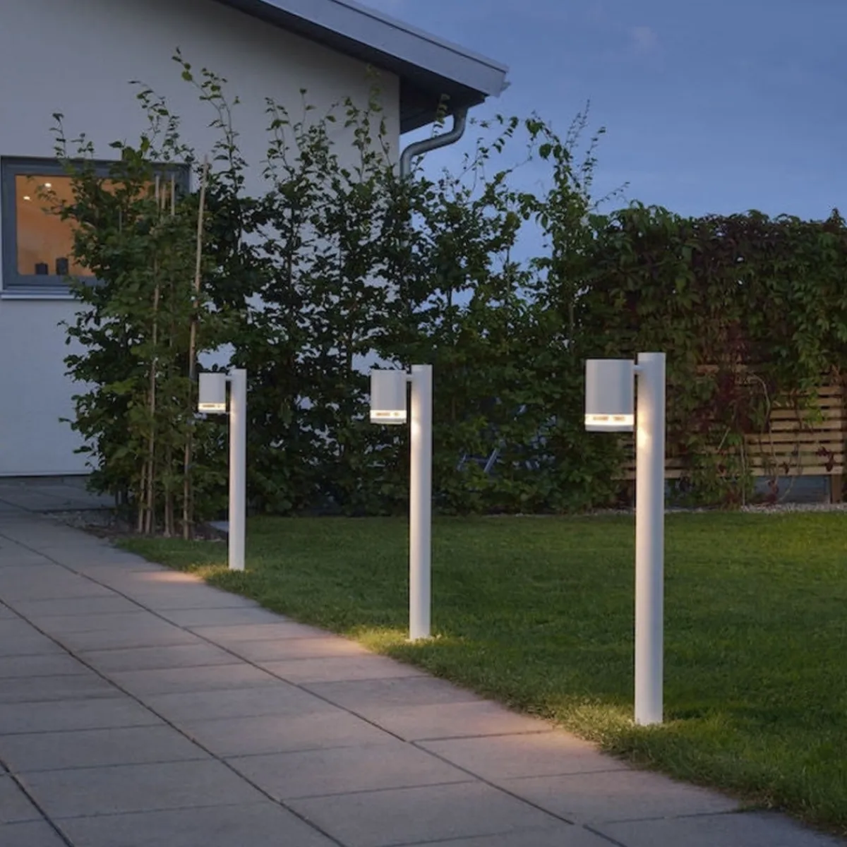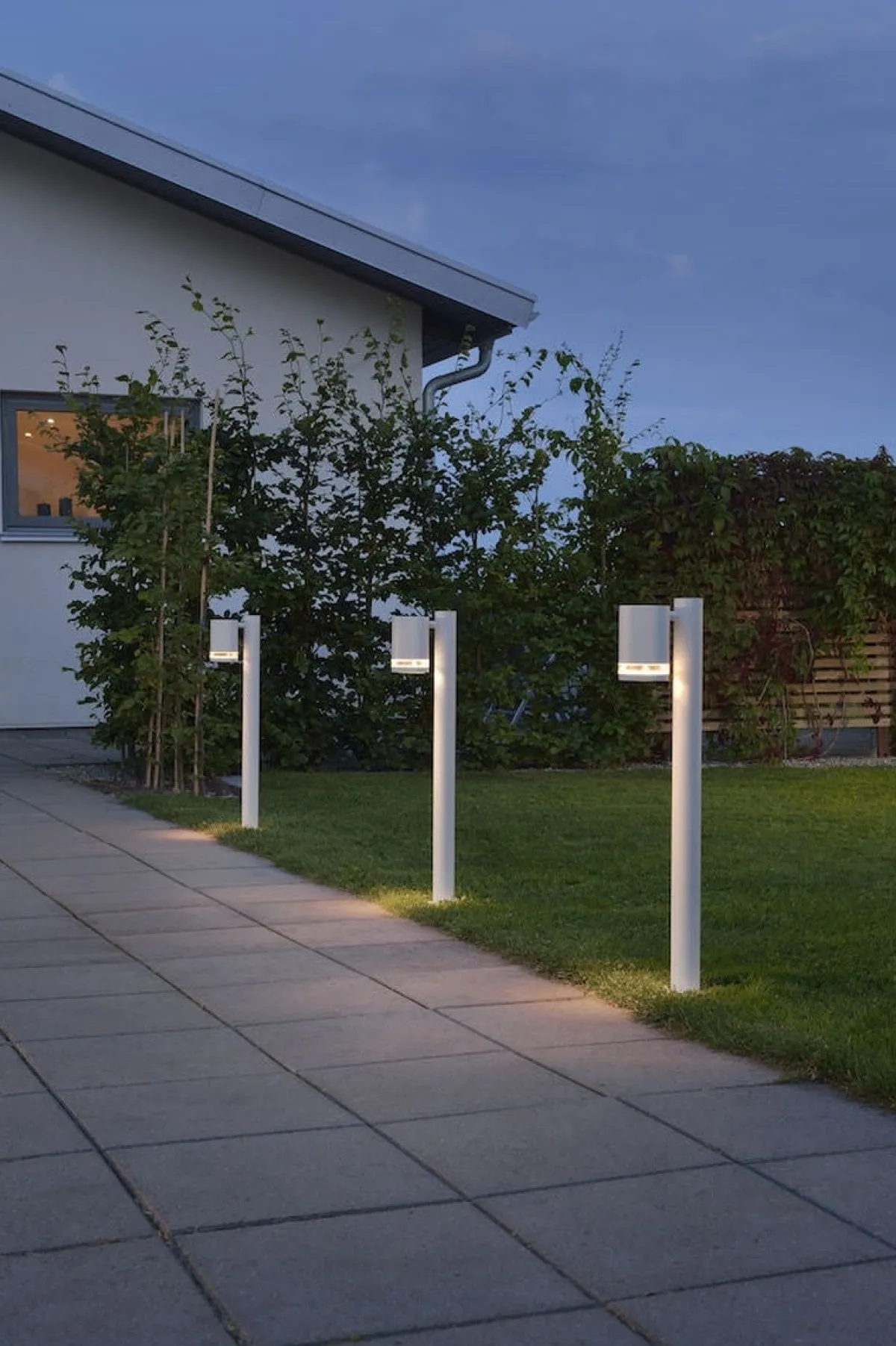 Flott pullert med nedlys i aluminium med dekorring i akrylglass. I bunnen har lampen klart glass.