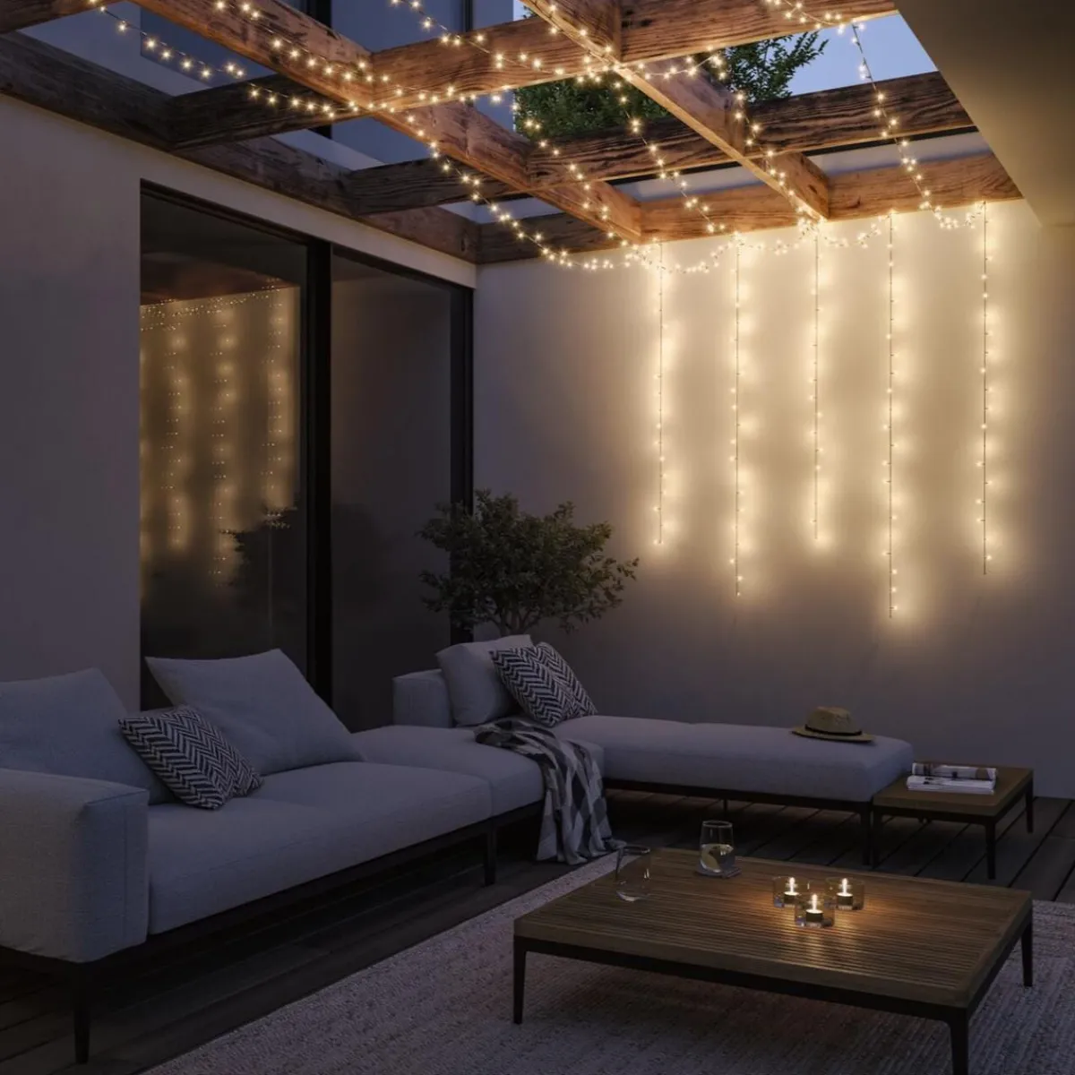 Yuna Plug & Shine-lyslenkene er det perfekte valget for stemningsfulle utendørsøyeblikk. På trær, terrasser eller rekkverk er de et iøynefallende element og gir dekorative lysaksenter. Med en lengde på 7,4 m og en fargetemperatur på 3000 K avgir disse lyslenkene et varmt, hvitt og innbydende lys. IP44-beskyttelse beskytter lysene mot sprutvann, noe som betyr at disse lyslenkene kan installeres utendørs sesongmessig eller permanent. I kombinasjon med transformatorer, kontakter og andre armaturer fra Plug & Shine-serien, vil du ha en tilpasset utendørs belysningsinstallasjon klar på kort tid.