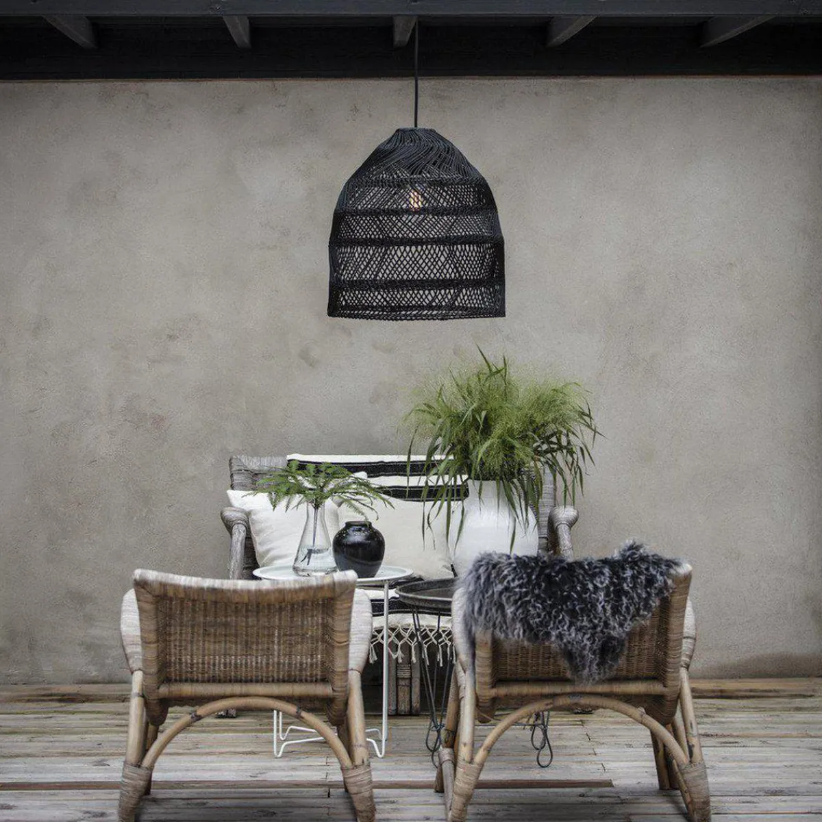 Maja takskjerm i en vakker vridd rotting. Passer like godt utendørs under tak, i drivhus og vinterhager som innendørs Husk at det er et naturmateriale og at vær og vind kan påvirke utseendet. Takskjermen selges sammen med Flex out lampeoppheng. 2,5m lampeoppheng IP44 godkjent for utendørs bruk som ligger med i pakken.