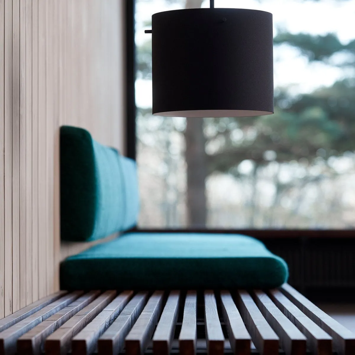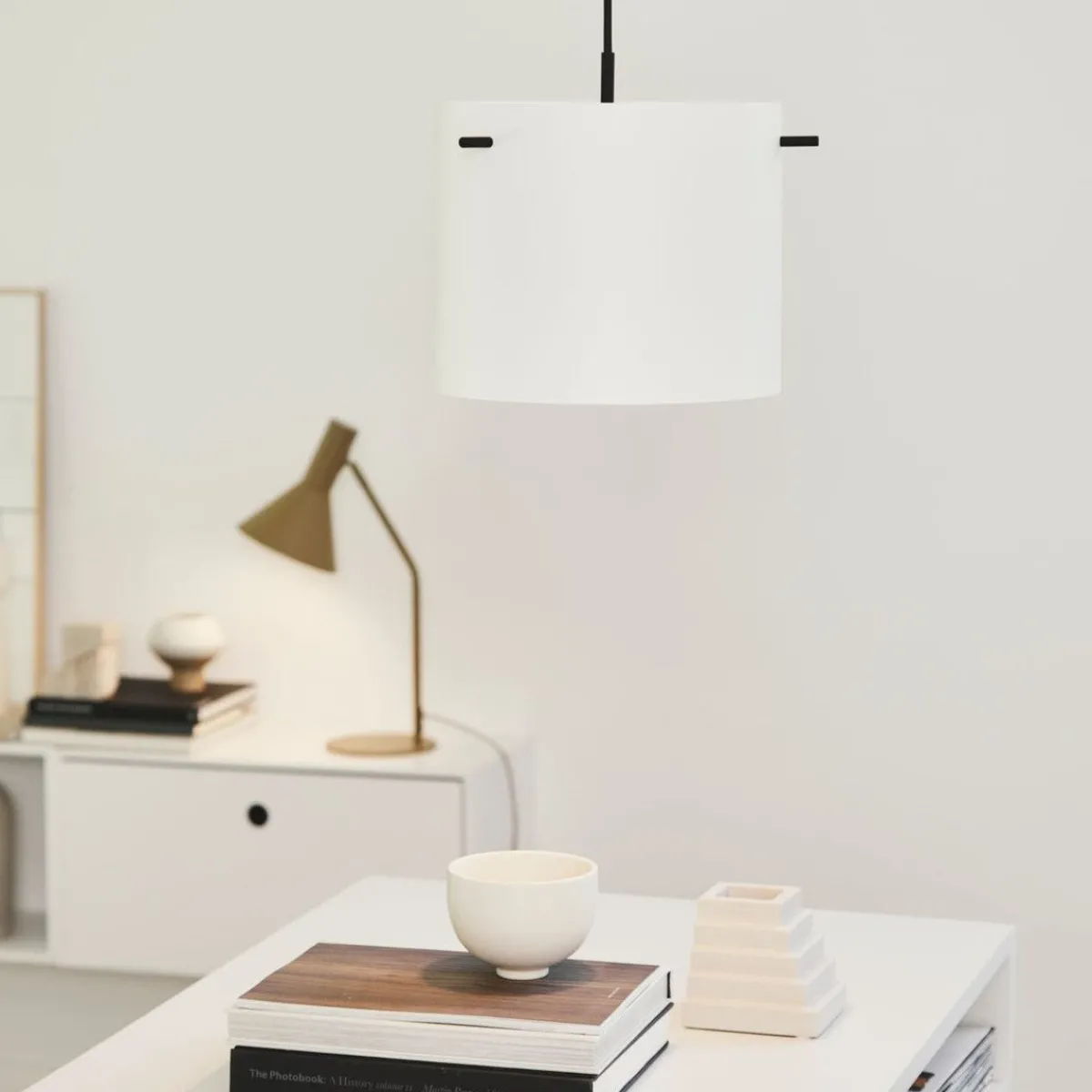 FM1954 Pendel er tilgjengelig i tre størrelser og tre farger – svart, hvit og grå/sand struktur. Leveres med en sort stoffledning og svart baldakin.