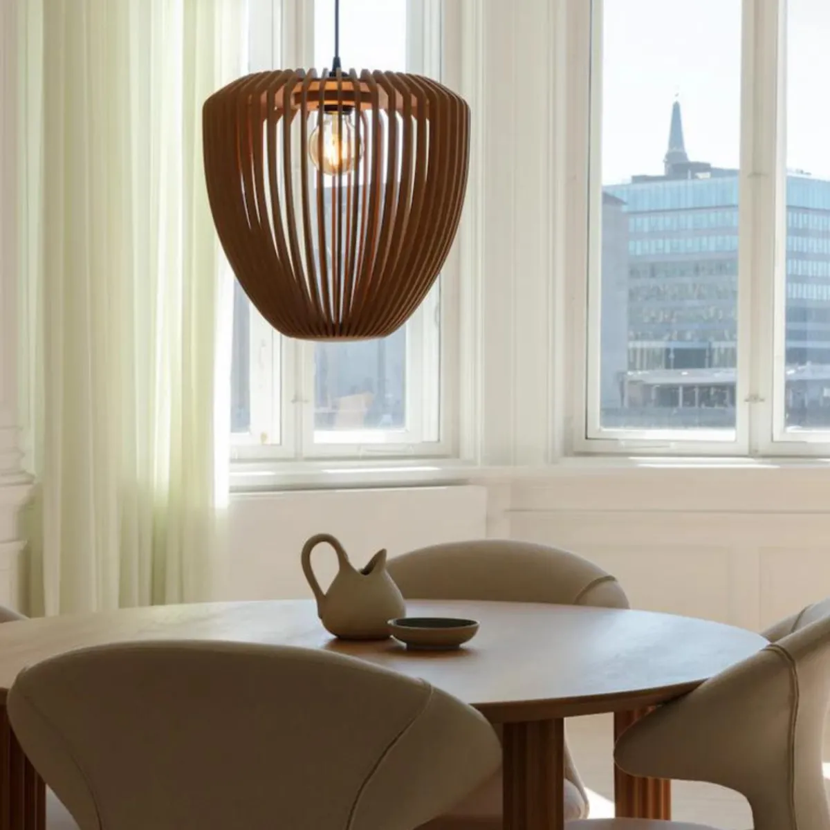 Clava Dine Wood-lampeskjermen er designet av en håndverksteknikk som krever en unik presisjon og nøyaktighet på grunn av den lille avstanden mellom hver lamell. Tre lamellene er laget av laserskåret ask og finér av eik med solid eik. Lampeskjermen skiller seg ut som et skulpturert designverk som skaper en lekende lysglimt på veggene i det omkringliggende rommet. Lampehettenes troskap skaper et vakkert mønster som kan beundres fra alle vinkler, både på innsiden og på utsiden av lampeskjermen.