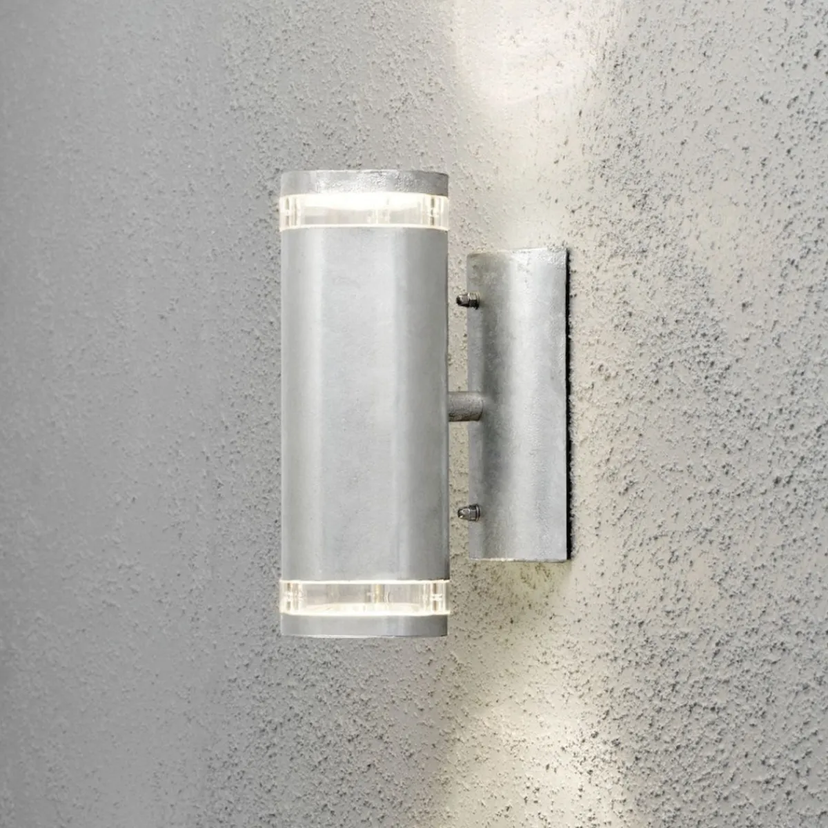 Moderne og dekorativ utelampe som lyser kraftig både opp og ned på veggen. Lampen er en del av en lampe-serie som finnes i flere varianter.