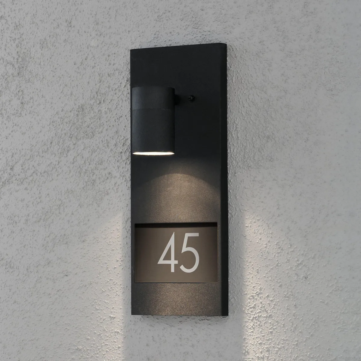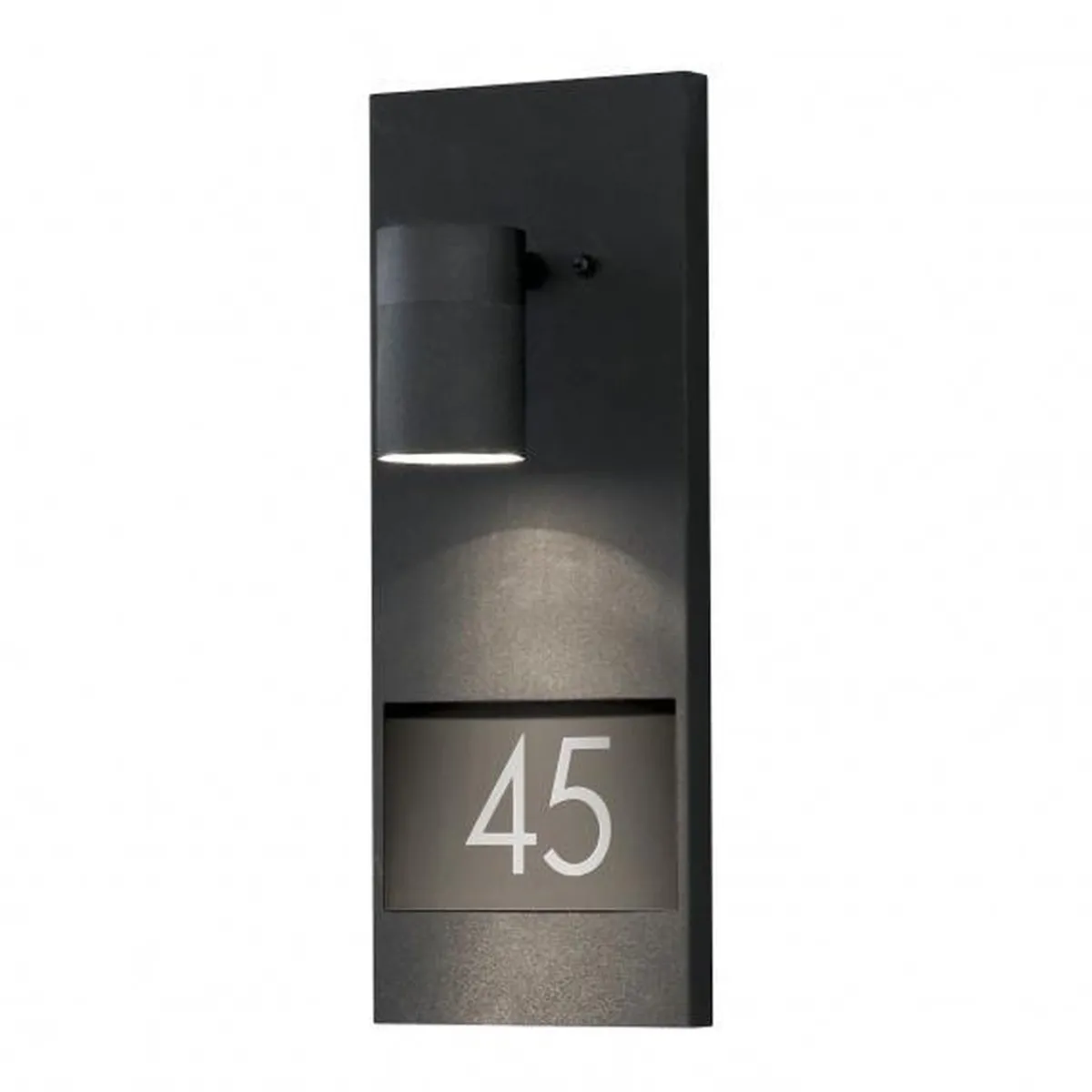 Moderne svart vegglampe med husnummer. Dørskilt med lampe som er en del av en lampeserie.