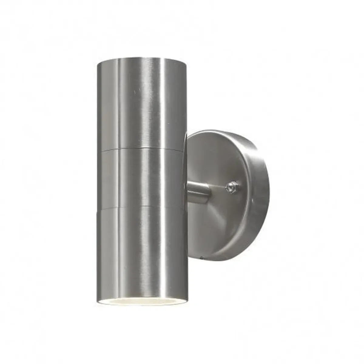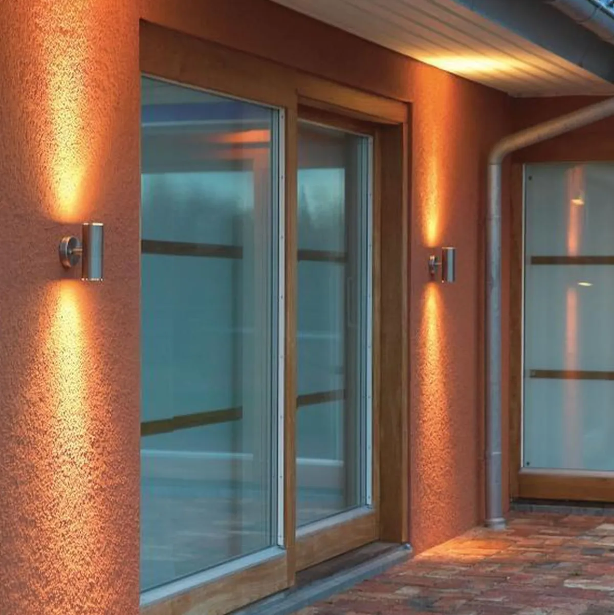 Moderne vegglampe i rustfritt stål som lyser opp og ned på veggen. Monteres til fast anlegg.