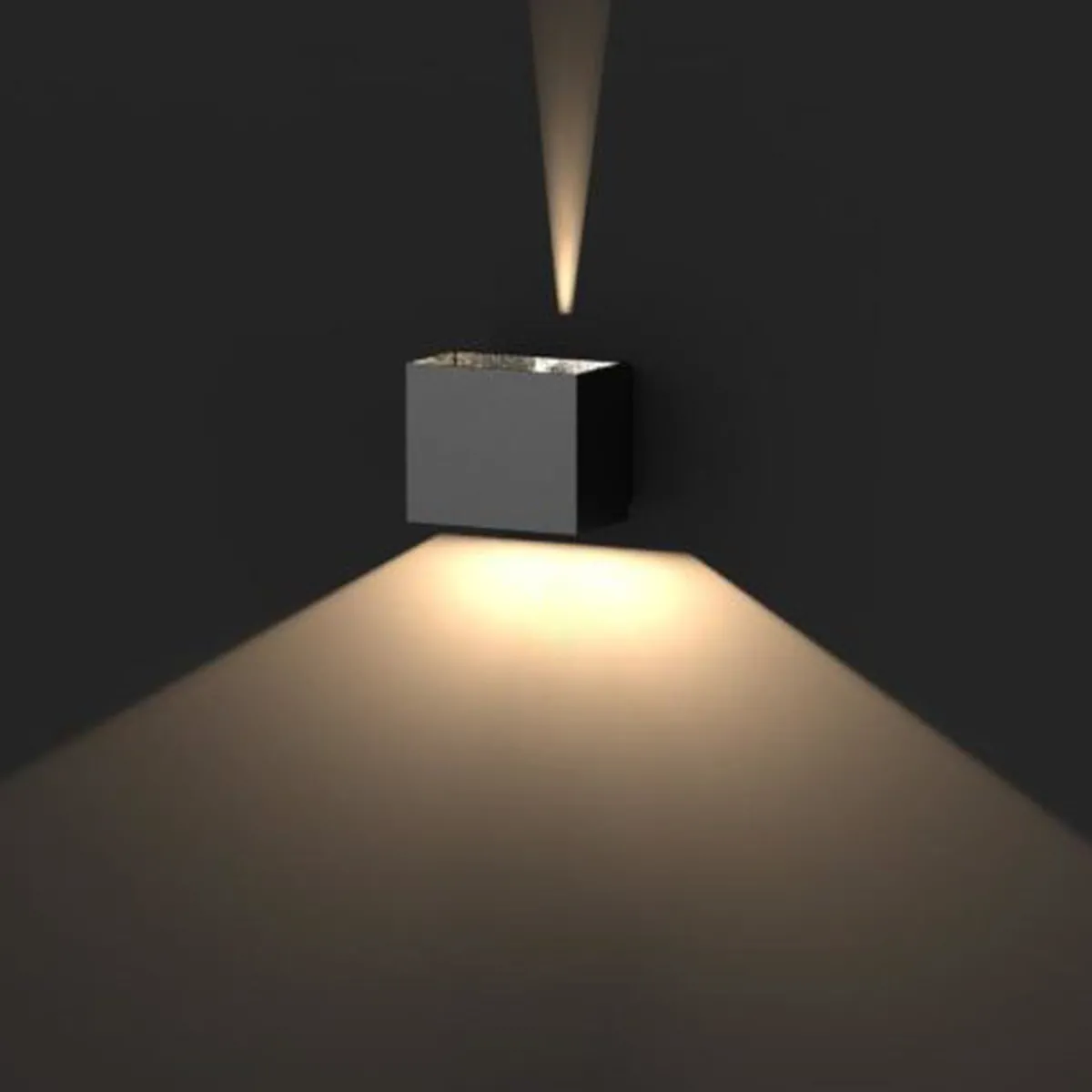 Veggmontert utelampe med opp/ned lys i moderne design. Lysfordelingen kan justeres fra 15° til 210° ved å endre posisjon på de innvendige klaffene. Materiale av aluminium.